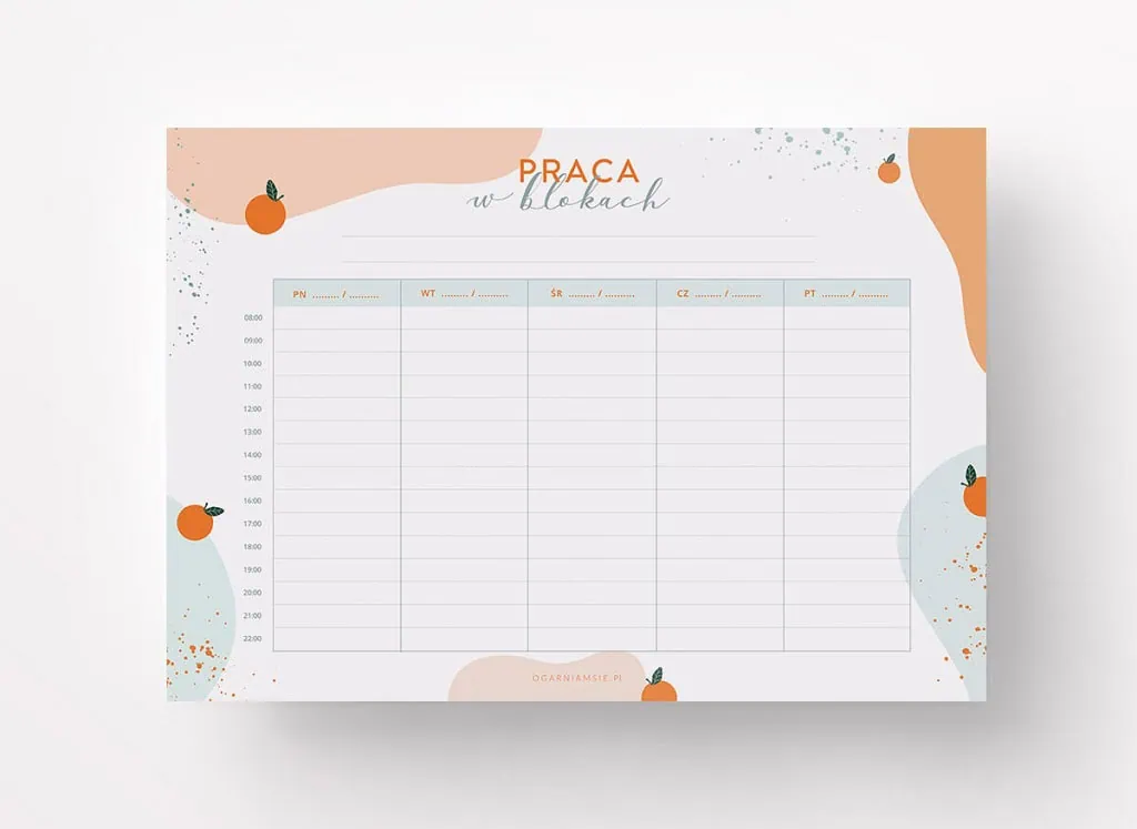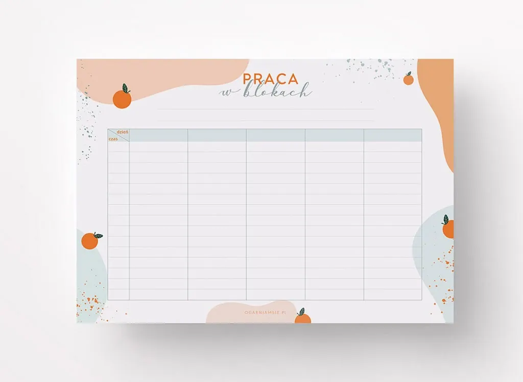 Zaczynamy od propozycji, do której masz już narzędzie – szablon z planera Ogarniam Maturę. Ta technika polega na nauce w tzw. blokach, czyli w zaplanowanych ramach czasowych. Gdy już ustalisz priorytety i ogólny plan nauki do matury postaraj się zaplanować konkretny dzień, tak by zgrupować zadania. Chodzi o to, by na jedno konkretne zadanie – w Twoim przypadku np. na naukę matematyki – przypadł jeden konkretny blok czasowy np. 8:00-9:00. Dzięki temu nie będziesz tracić energii na planowanie „na żywo”. Na cały dzień będziesz mieć jasny i przejrzysty plan działania. Ta metoda jest prosta, przyjemna i ma wiele korzyści. Uporządkowany dzień, estetycznie zakolorowany harmonogram nauki do matur oraz motywacja do maksymalnego skupienia się na danym zadaniu.