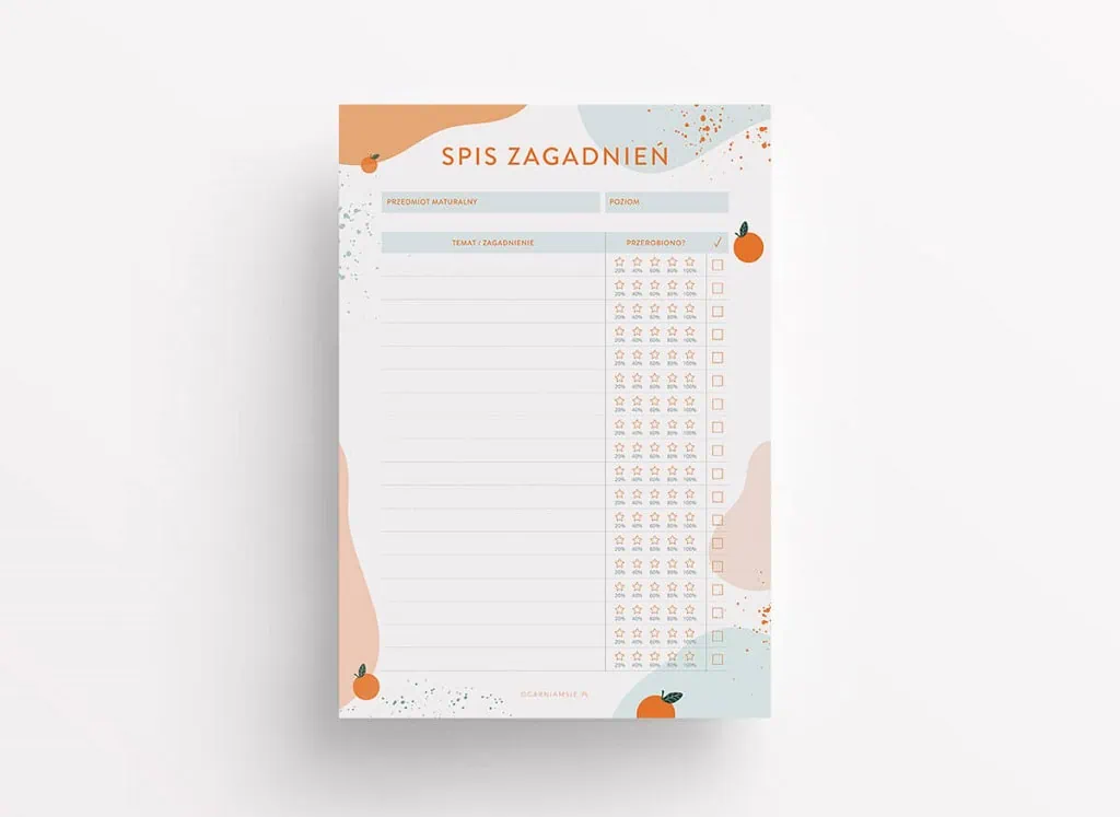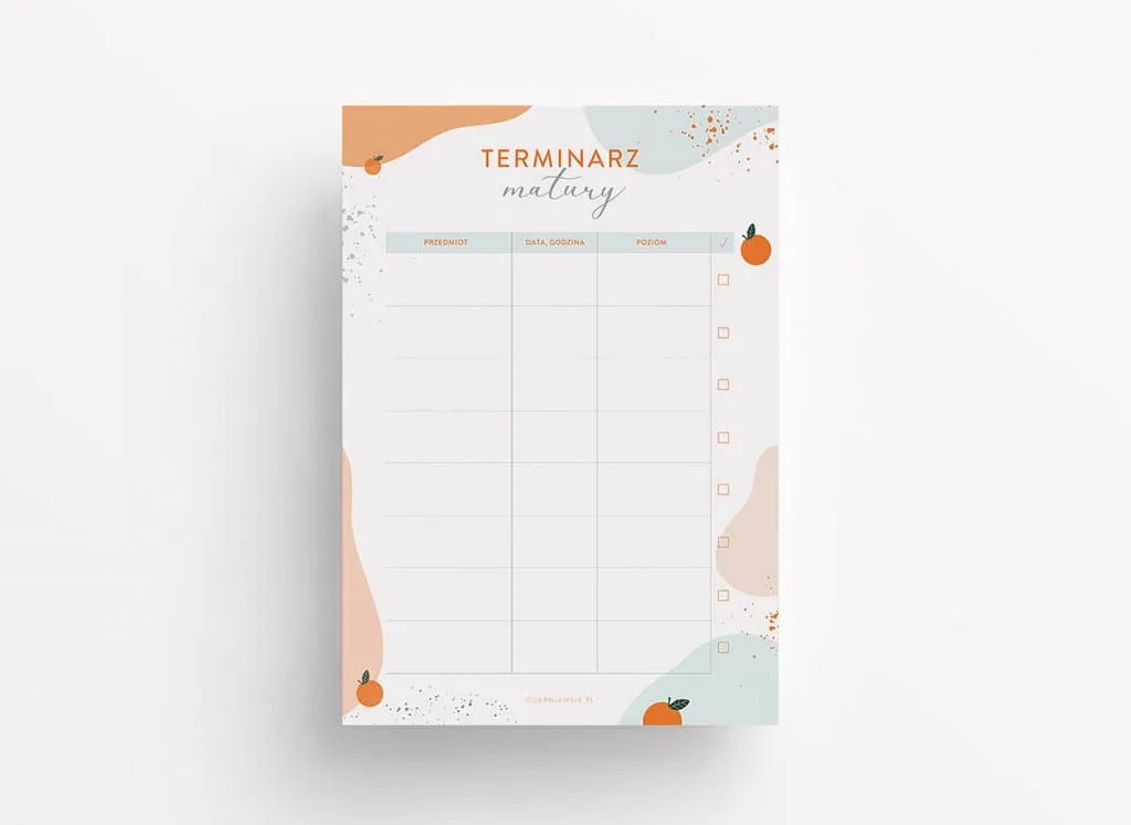 Plan nauki do matury pdf to wygodny sposób na zapanowanie nad tym procesem. Dzięki korzystaniu z naszego darmowego planera, wszystkie organizacyjne sprawy będziesz zbierać w jednym miejscu. Oszczędzisz czas – koniec z szukaniem zapodzianych luźnych kartek. W planerze zapiszesz daty matur, stworzysz rozpiskę konkretnych dni czy zgrupujesz zadania. A to wszystko ubrane w przepiękną szatę graficzną. Wypełnij poniższy formularz i zabieraj się do pracy! Ale, ale – wróć jeszcze na chwilę, by przeczytać o technikach nauki, z którymi pytanie jak uczyć się od matury odejdzie w zapomnienie.