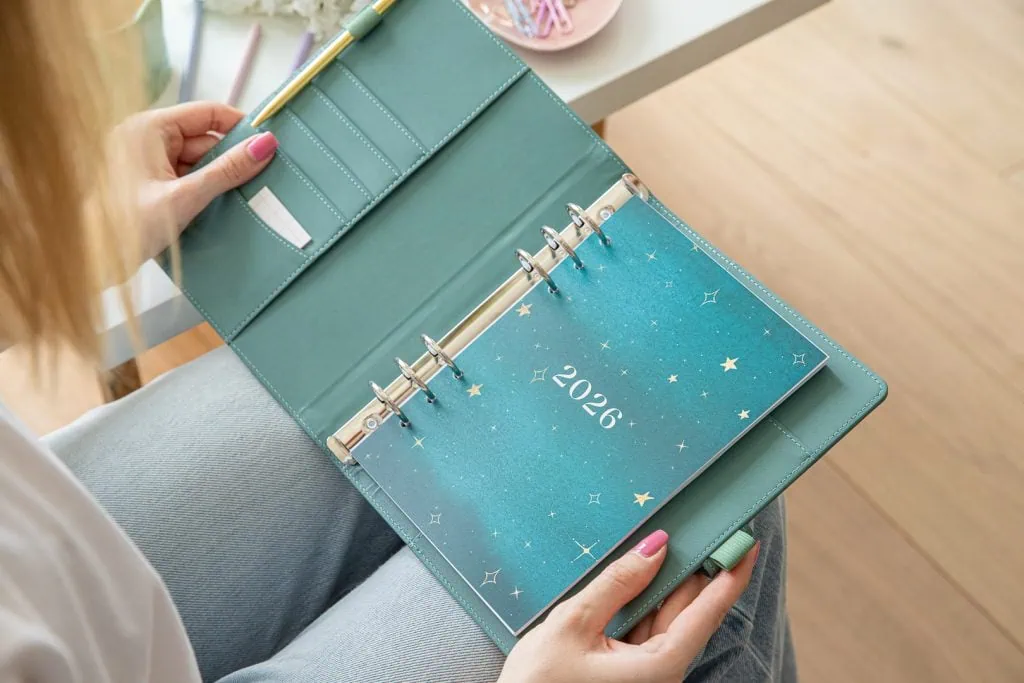 Organizer 2026 to taka Twoja osobista „komenda główna”. W środku masz wszystko, co tylko sobie wymarzysz: kalendarz, zadania, budżet, cele, notatki, sekcję ślubną, listę pomysłów na prezent dla siostry, trackery nawyków, plan domowego remontu i harmonogram wizyt u kosmetyczki. I to wszystko w jednej okładce, dokładnie takiej, jak chcesz. Z ringami, które pozwalają przekładać kartki, dodawać nowe wkłady albo wymieniać wszystko, gdy stary system przestaje działać.