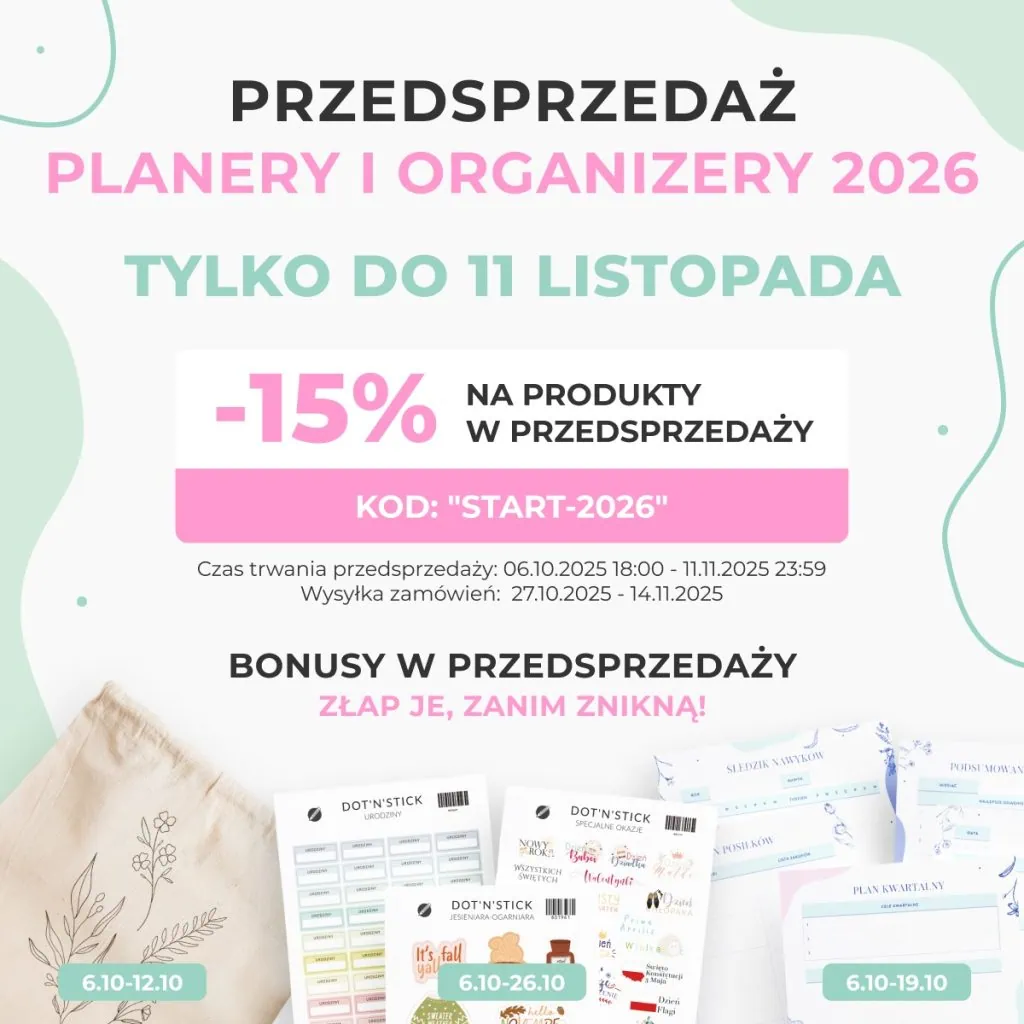Tydzień 1 (06.10.2025 – 12.10.2025) : Zestaw naklejek + worek na planer/akcesoria + PDF z szablonami do druku + rabat