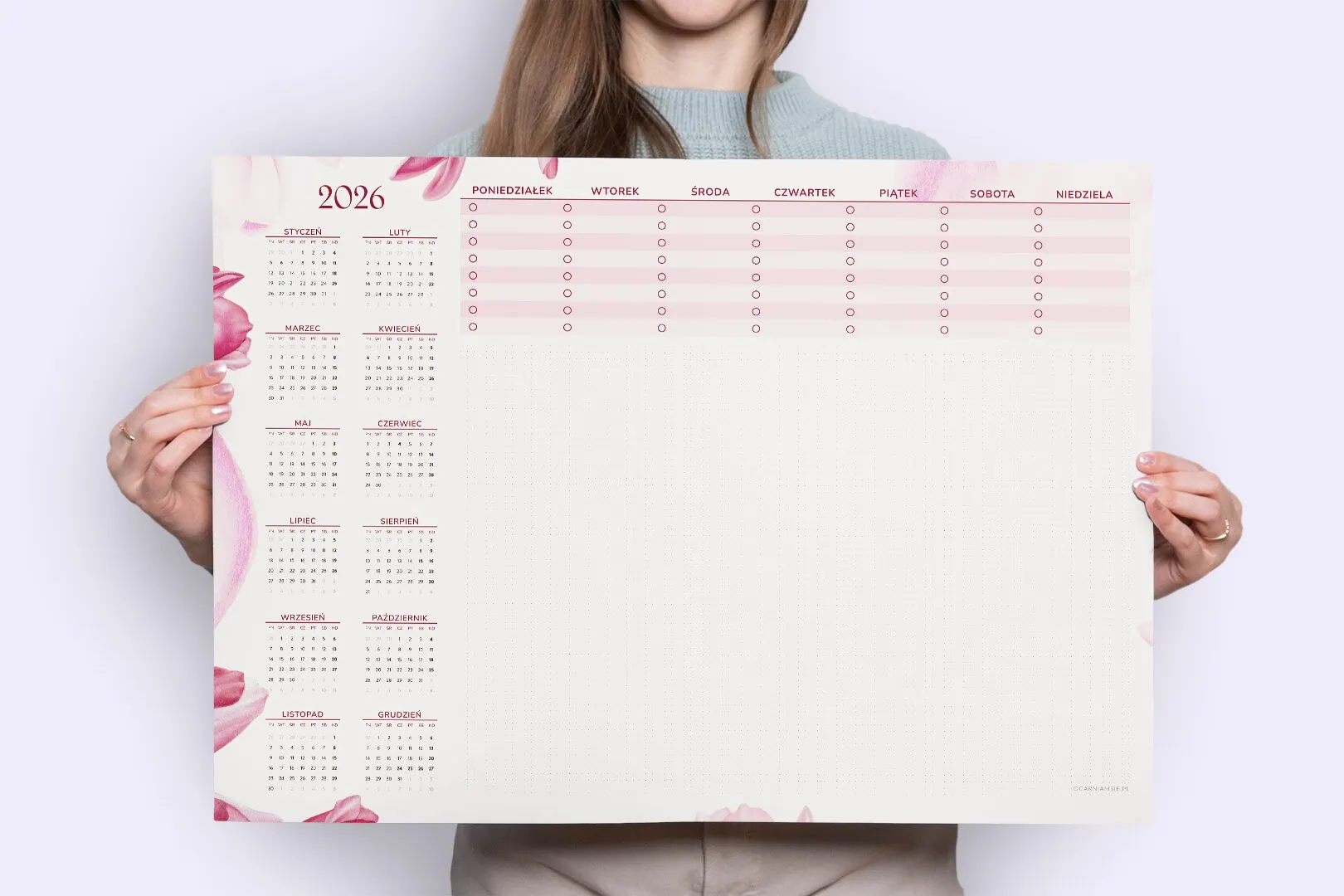Na górze — przejrzysty układ tygodniowy wraz z listą zadań. Po lewej — pełny kalendarz od stycznia do grudnia na 2026 rok. Cała reszta to przestrzeń do notowania, planowania lub bazgrania, gdy trzeba wyrzucić z głowy myśli. Sprawdzi się na luźne notatnki, plan posiłków, mapę myśli albo szybki szkic projektu.