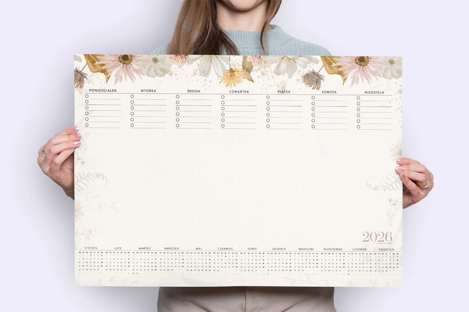 U góry znajdziesz miejsce na listę zadań na każdy dzień tygodnia, na dole pełny przegląd miesięcy od stycznia do grudnia 2026. Pośrodku — sporo miejsca do wykorzystania na notatki, szkice, rozpiski projektów, mapy myśli i wiele więcej.