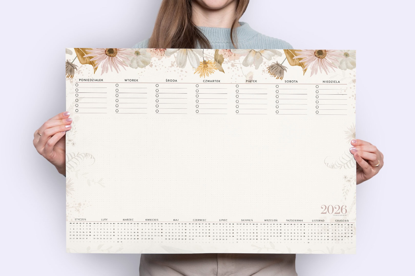Piękna podkładka na biurko to kalendarz na cały 2026, miejsce na listę zadań oraz mnóstwo miejsca na notatki w jednym!