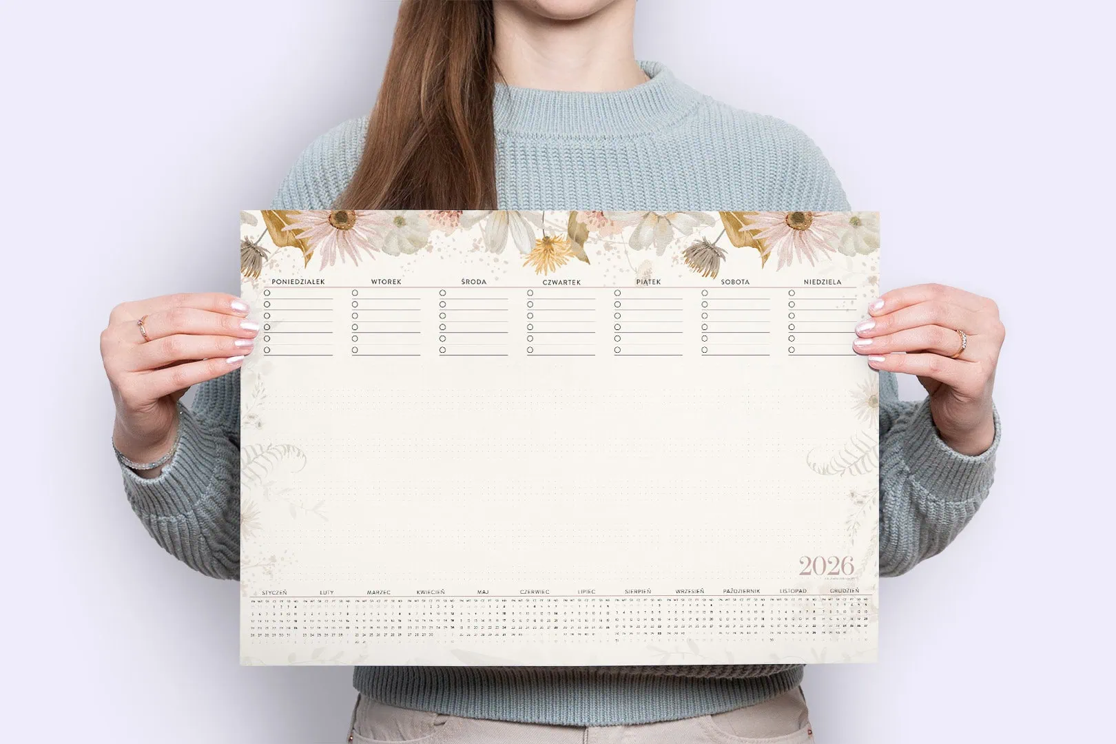 Biuwar łączy funkcję kalendarza na rok 2026, tygodniowego planera oraz przestronnej powierzchni na notatki – a wszystko w formacie A3, który idealnie wpasuje się nawet na mniejsze biurko. Dzięki temu możesz położyć na nim laptopa lub klawiaturę, a i tak mieć pod ręką wszystko, co ważne.