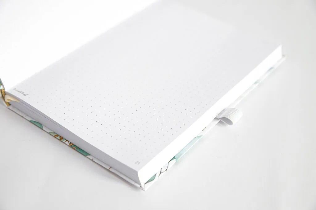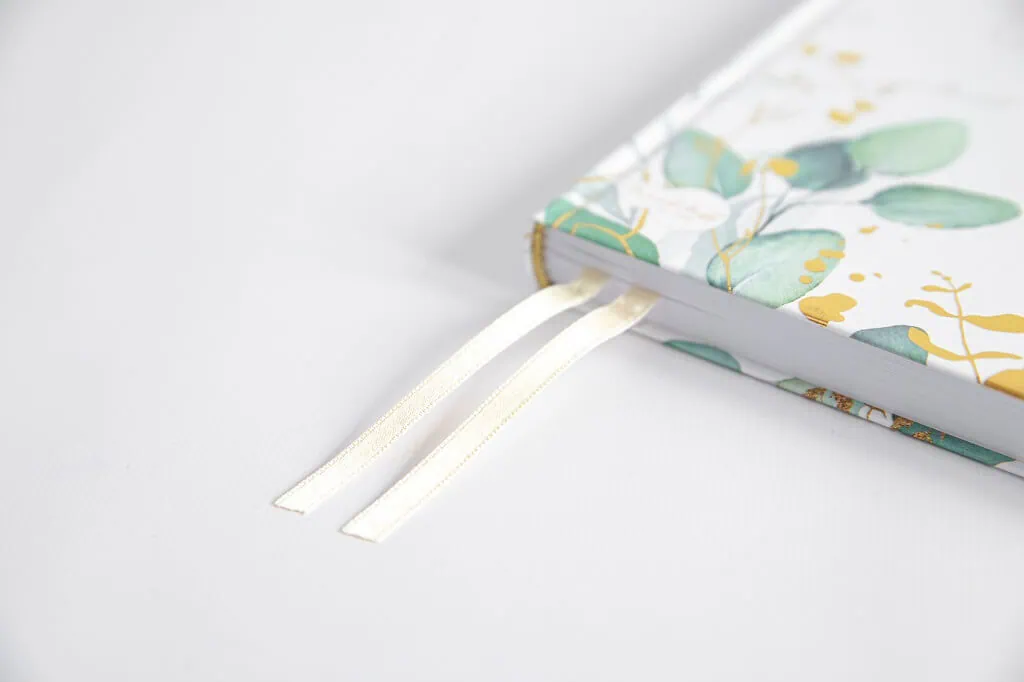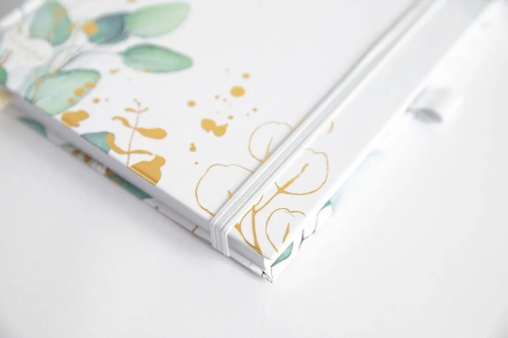 Notes do bullet journal ma minimalistyczną okładkę w liściasty wzór. Jasne kolory połączone z zielenią prezentują się bardzo elegancko.
