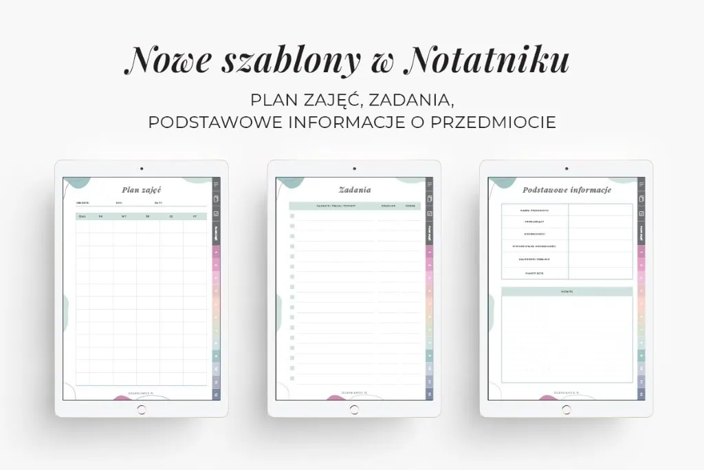 Dodaliśmy do notesu digital plan zajęć w dwóch wersjach - dla studentów dziennych lub studentów zaocznych oraz szablon Zadania. Dodatkowo wprowadziliśmy miejsce na podstawowe infromacje o przedmiocie.