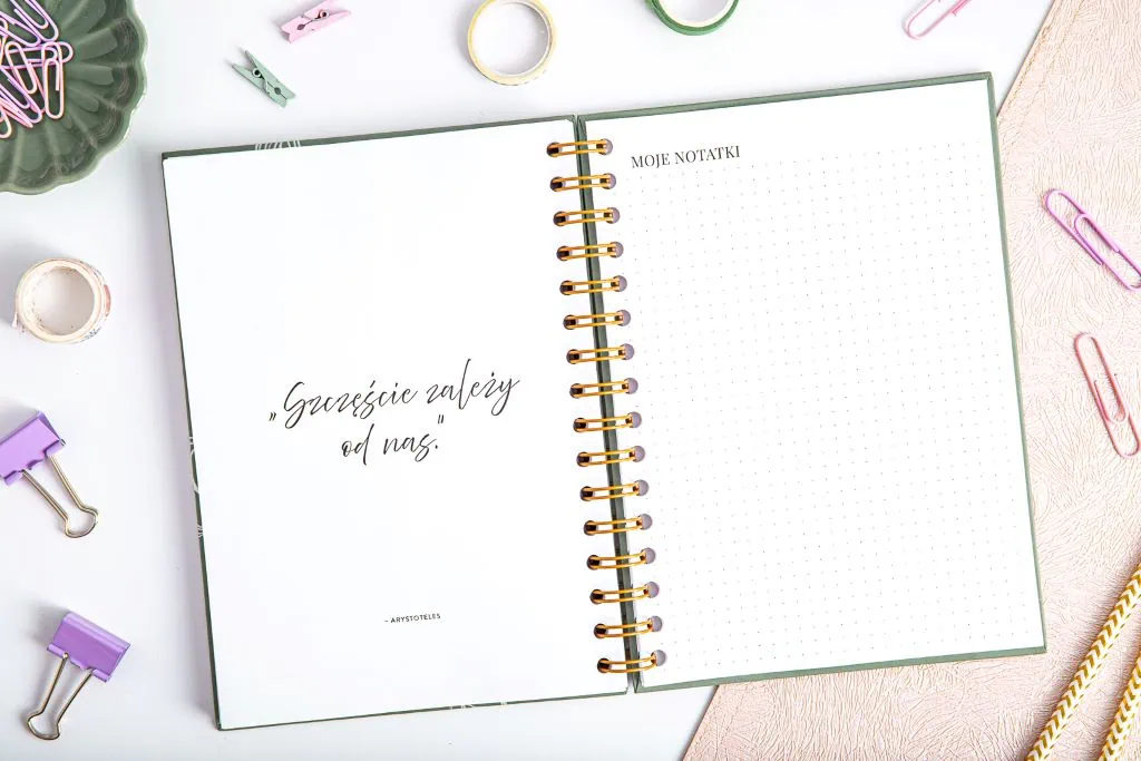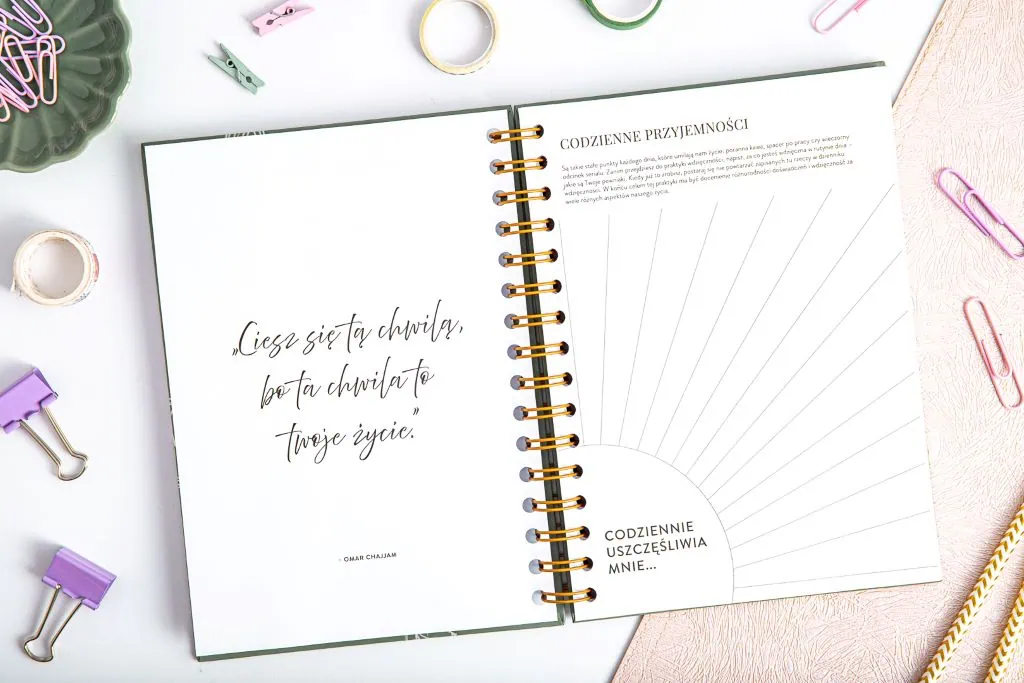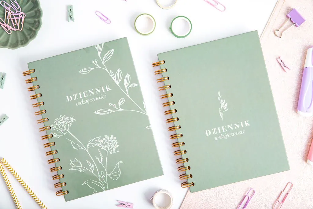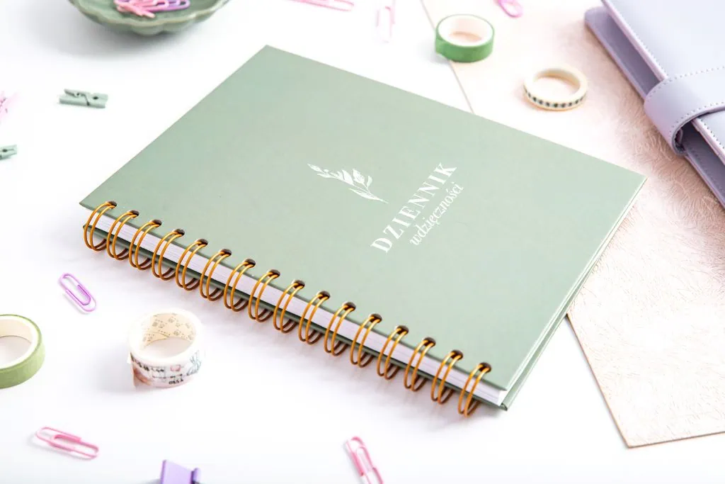 Poszukując sposobów na pielęgnowanie swojego dobrostanu psychicznego i duchowego, dziennik wdzięczności staje się niezastąpionym narzędziem. Nasz notes wdzięczności to nie tylko zwykły notes, towarzyszy Ci w podróży odkrywania piękna życia i doceniania drobnych chwil. Wybierz jedną z dwóch wariantowych twardych okładek, by lepiej odzwierciedlić swoją osobowość. Piękne zielone kolory cieszą oko, a spirala pozwala otworzyć dziennik afirmacji na płasko, co ułatwia korzystanie.