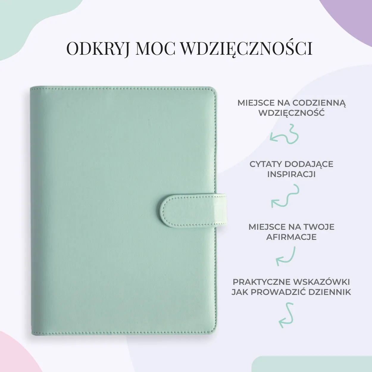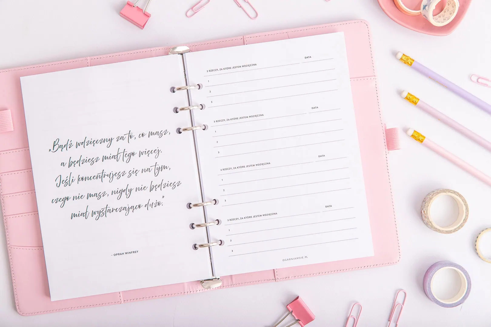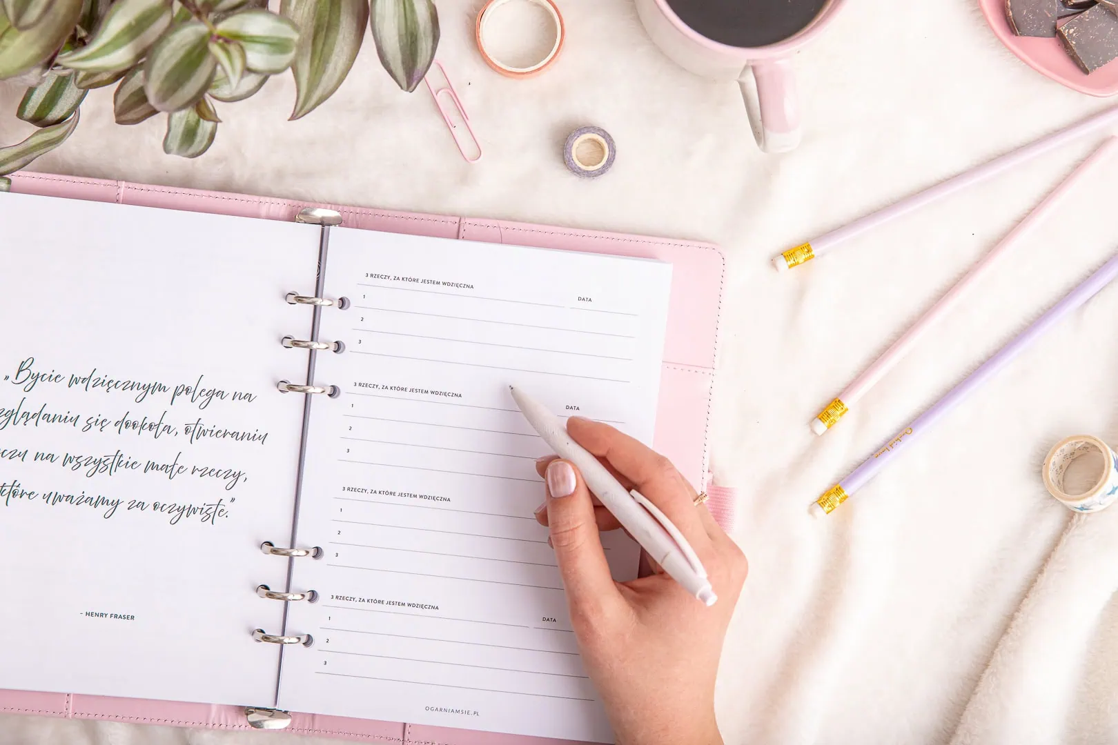 - Listy wdzięczności – miejsce na zapisanie 3 rzeczy, za które jesteś wdzięczna każdego dnia.
