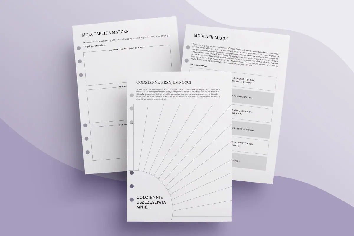 - Miejsca na zapisanie swoich własnych afirmacji – wszystko, by wzmacniać pozytywne myślenie i wiarę w siebie.