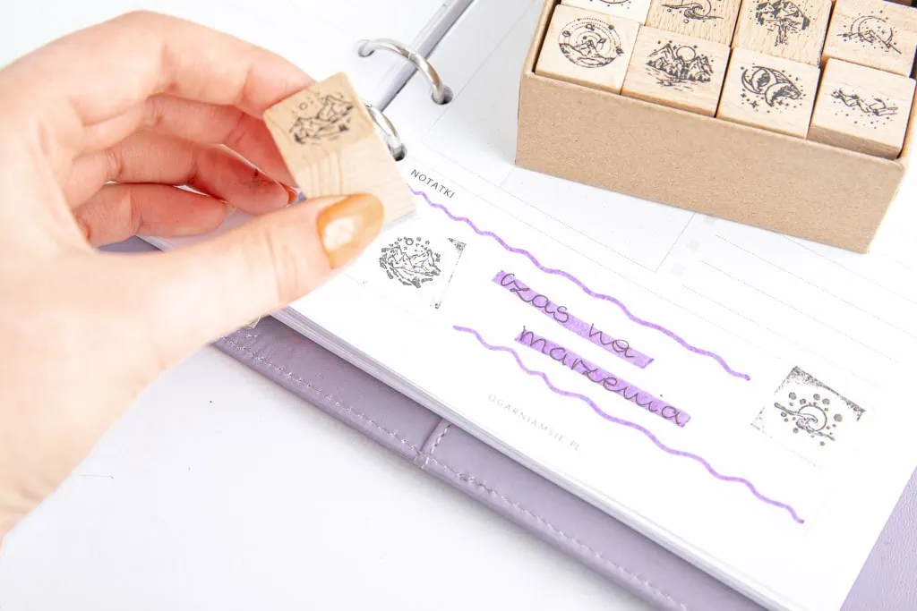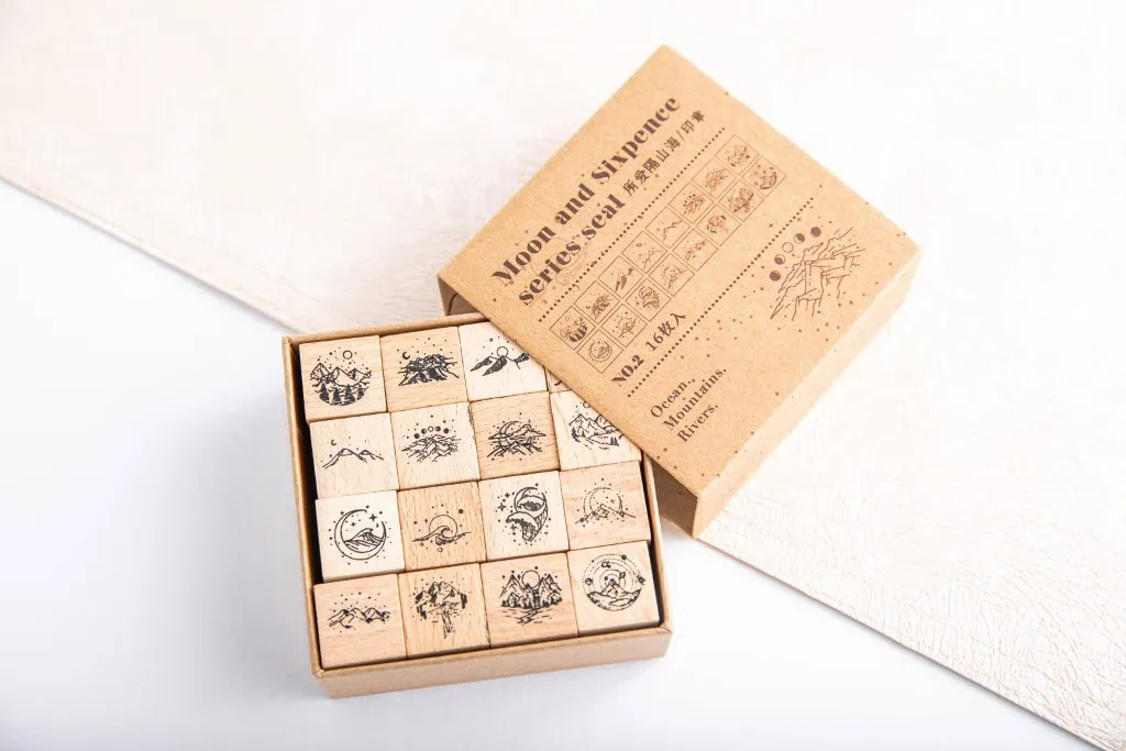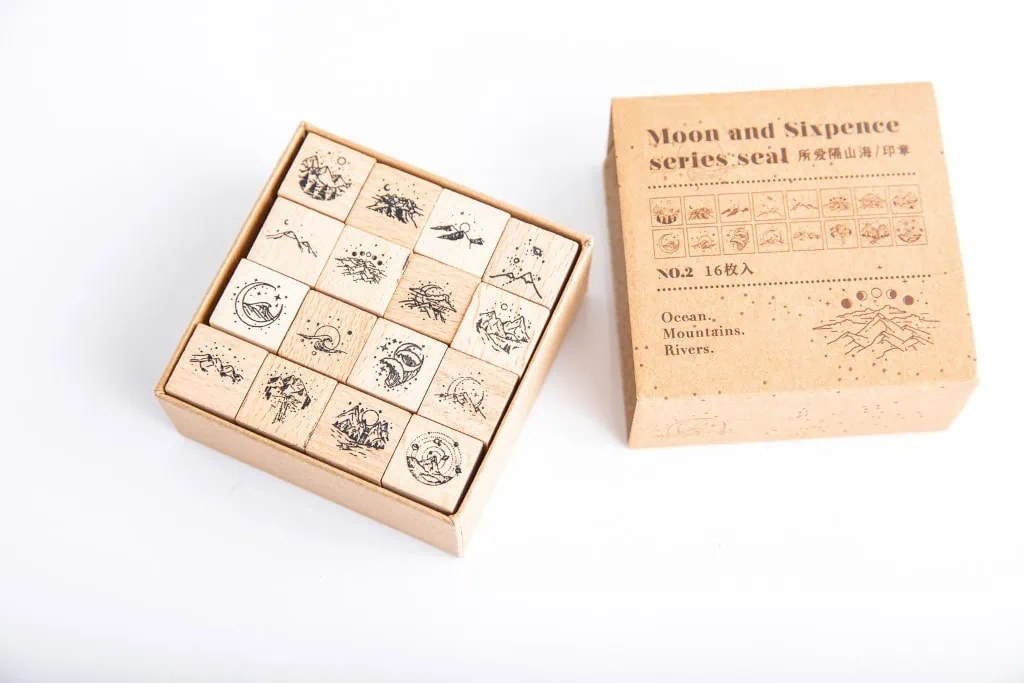 Zestaw 16 drewnianych stempli idealnych do scrapbookingu czy ozdobny bullet journalu, planera. Stemple mają 16 różnych, pięknych wzorów. Łączy je motyw gór oraz morza. Każdy stempel to wyjątkowa historia, którą w prosty sposób możesz odbić na kartce papieru i cieszyć się efektowną ilustracją. Pieczątki to ciekawy sposób na urozmaicenie swoich notatek lub relaksującą i kreatywną aktywność.