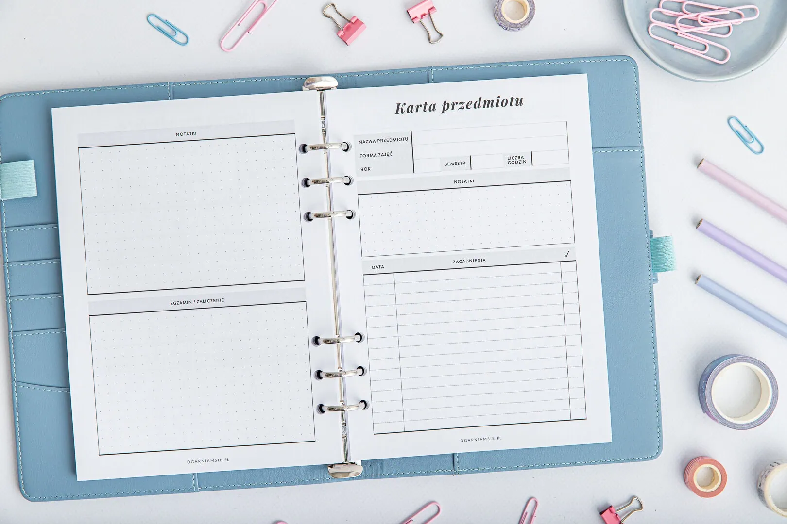 W jednym miejscu masz wszystko, czego potrzebujesz: harmonogram zajęć, karta przedmiotu, lista ocen, notatki ze spotkań i miejsce na planowanie sesji. Całość w przejrzystym i estetycznym układzie, który po prostu działa.