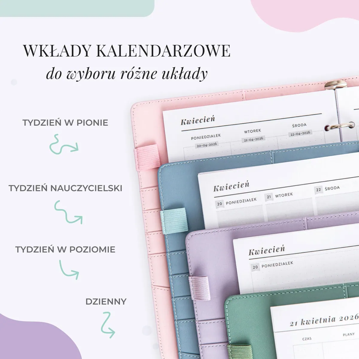 Każdy wkład - serce Twojego organizera - składa się z planera rocznego, kalendarza 2025/26, kalendarzy miesięcznych i tygodniowych. Dostępnych jest kilka wersji układów: