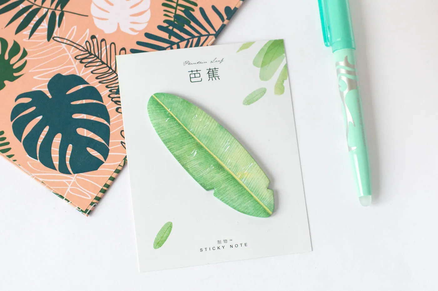 Wyjątkowo piękne karteczki samoprzylepne w kształcie zielonego, tropikalnego liścia. Jeden bloczek zawiera 30 karteczek w tym samym kształcie.
