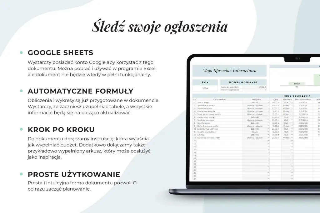 Sprzedajesz przez internet na Vinted i OLX? Sprzedaję na Vinted i OLX – Arkusz Google pozwoli Ci na ogarnięcie sprzedaży od A do Z! Zapisuj ogłoszenia i czuj, że ogarniasz! Znajdziesz tu: