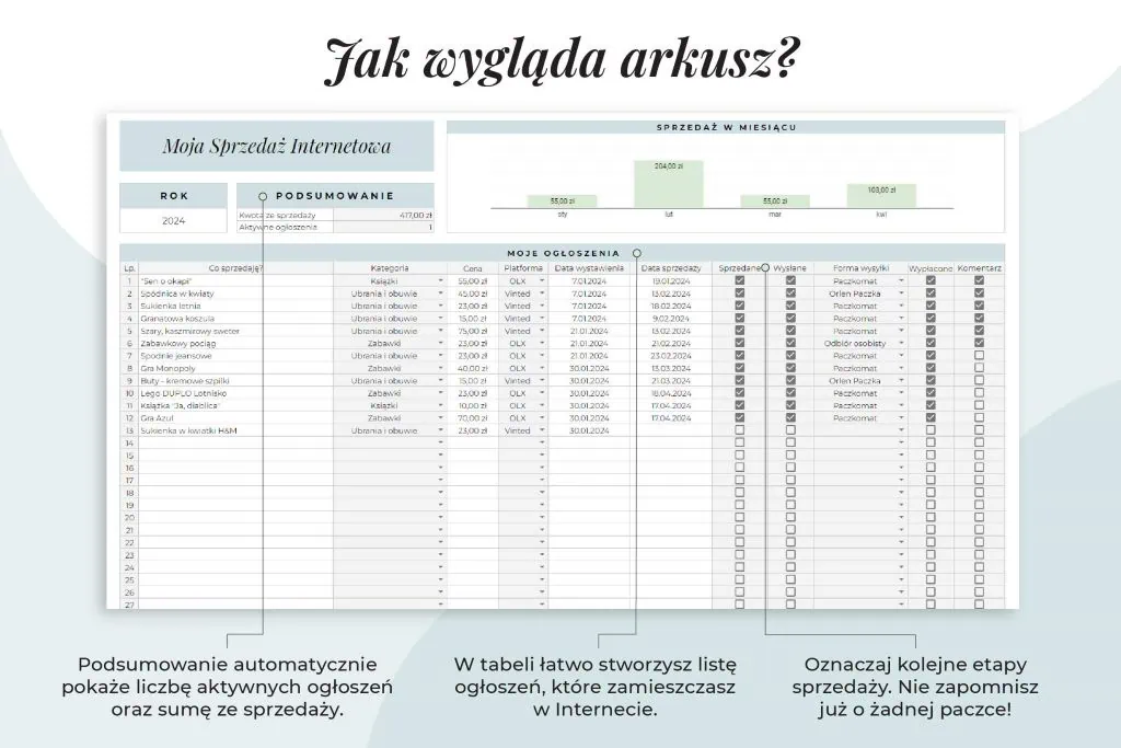 – zautomatyzowany plik – miejsce na spis Twoich ogłoszeń z wieloma parametrami do kontroli np. platforma sprzedażowa, forma wysyłki itd. A dzięki podsumowaniu szybko sprawdzisz, ile ogłoszeń masz aktywnych i jakie kwoty osiągnęłaś