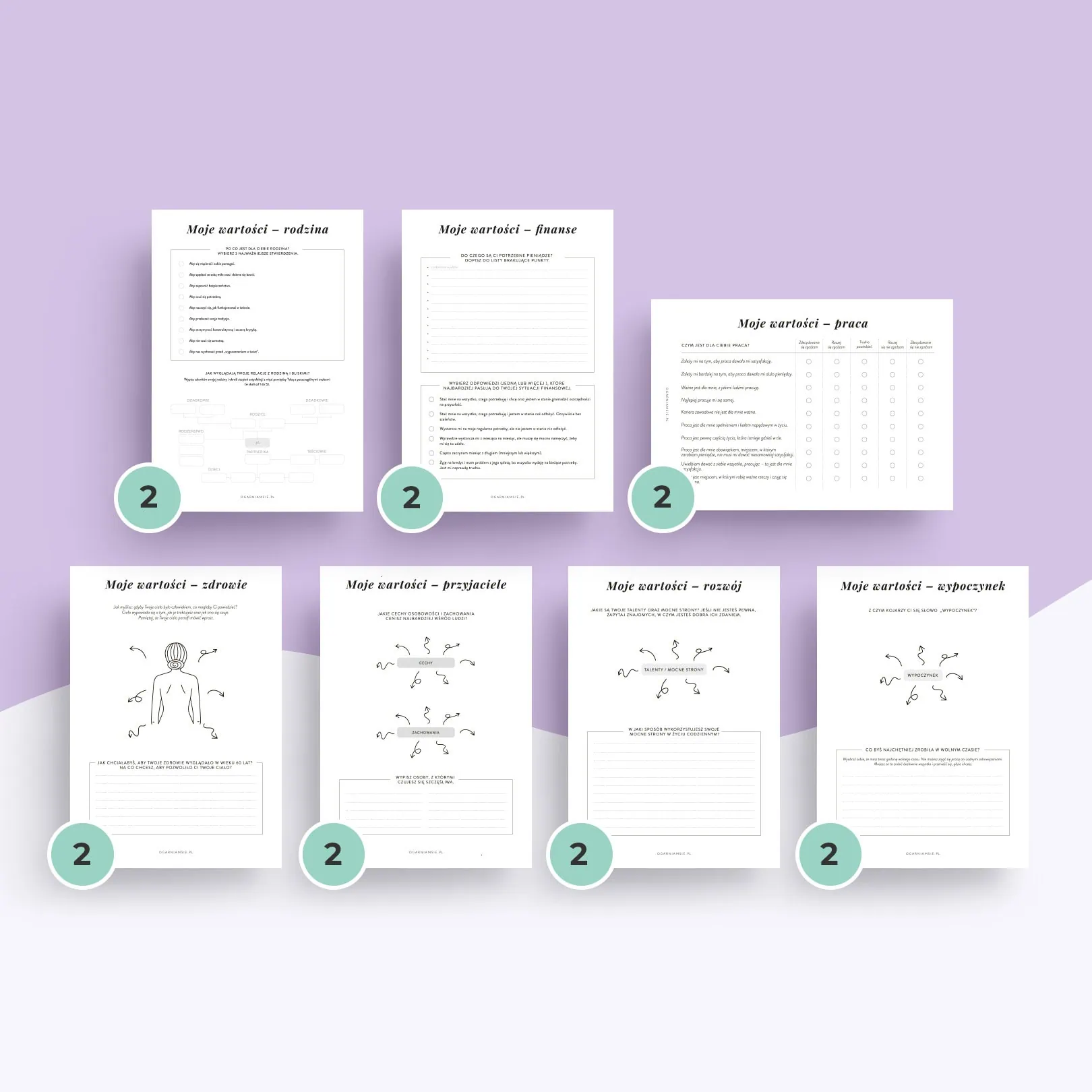 W zestawie znajdziesz szablony „Moje wartości” obejmujące kluczowe obszary życia: Rodzina, Finanse, Praca, Zdrowie, Przyjaciele, Rozwój i Wypoczynek. Każdy obszar to 2 strony z pytaniami i ćwiczeniami, które pomagają przyjrzeć się swoim przekonaniom, potrzebom oraz temu, czego na tym etapie życia najbardziej potrzebujesz.