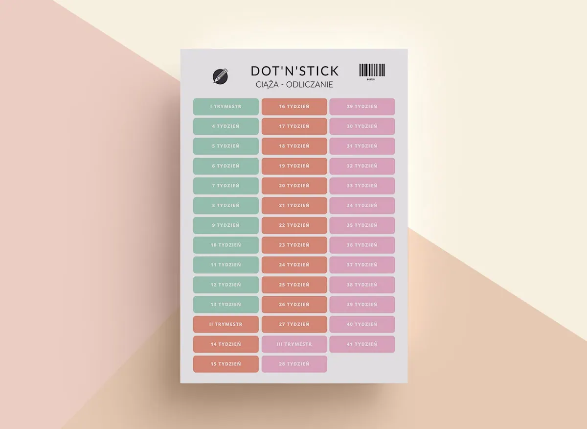 Naklejki „Ciąża – odliczanie” to doskonały sposób, by śledzić każdy tydzień w ciąży i celebrować ten wyjątkowy czas. Dzięki tym naklejkom z łatwością oznaczysz każdy tydzień, a także trzy trymestry. Kolorowe etykiety w pastelowych odcieniach ułatwią Ci organizację i uczynią odliczanie jeszcze bardziej radosnym.