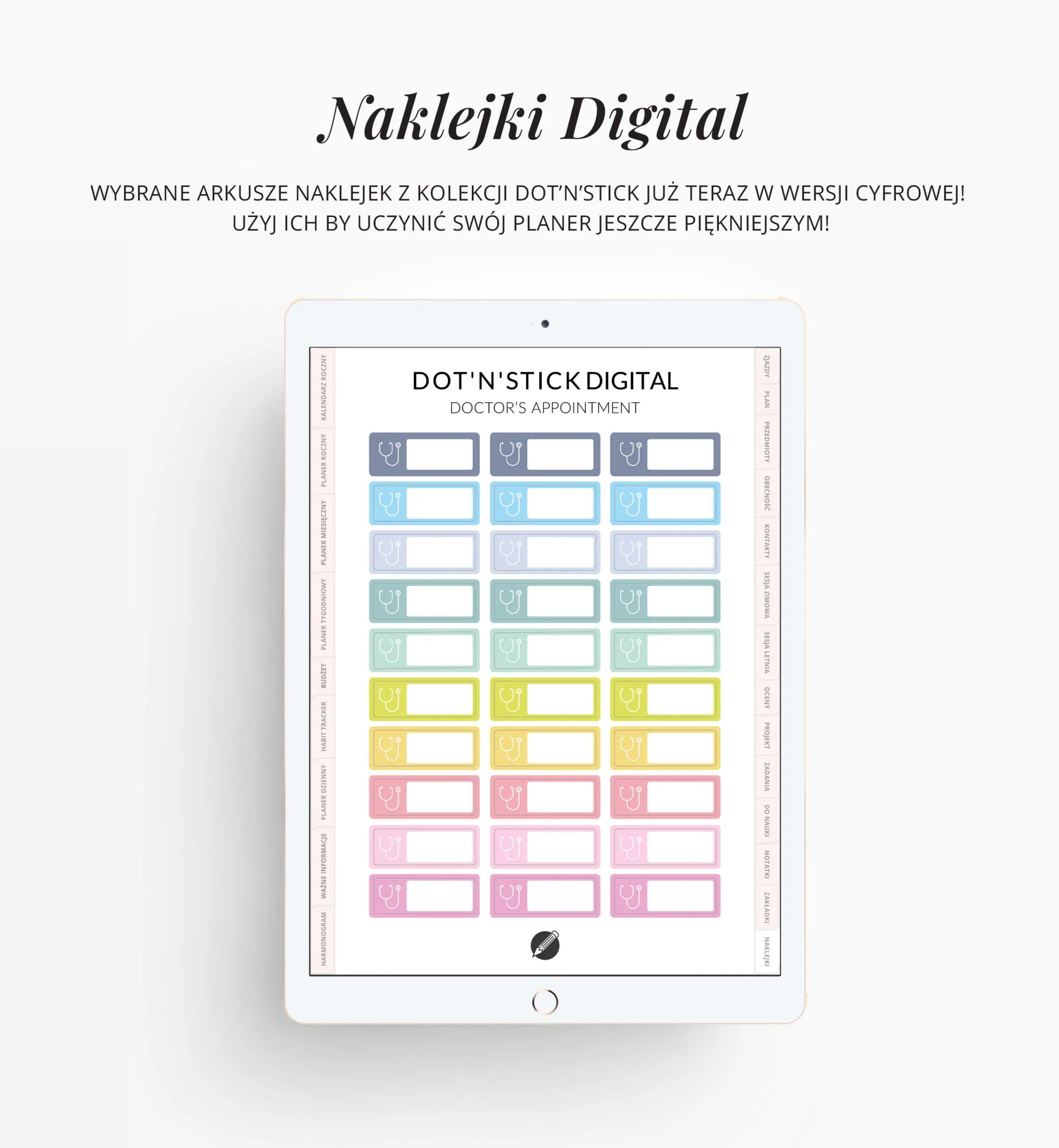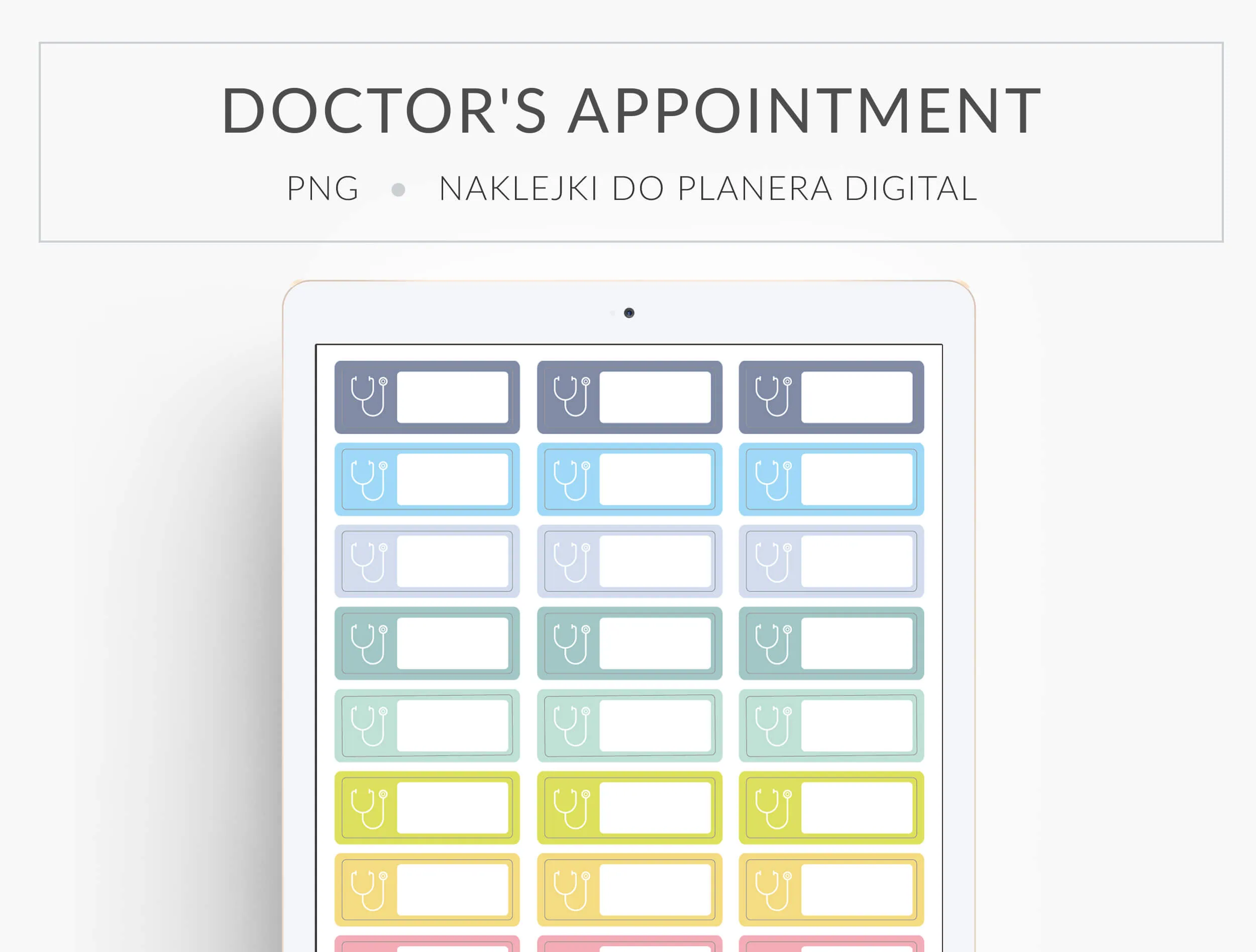 Te cyfrowe naklejki pomogą Ci ogarnąć wszystkie wizyty lekarskie! Zestaw składa się z różnokolorowych naklejek z symbolem stetoskopu. Wpisz odpowiednią datę, wklej do tabletu i już nigdy nie pomylisz godziny umówionej wizyty. Piękne pastelowe kolory będą dodatkowo ozdobą Twojego planera.