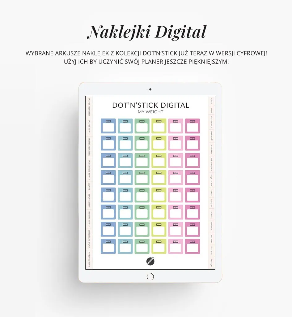 Naklejki digital My weight pomogą Ci kontrolować wagę. Zestaw zawiera naklejki w 6 kolorach – niebieskim, błękitnym, zielonym, jasnozielonym, jasnoróżowym i różowym. Na każdej znajdziesz miejsce do wpisania aktualnej wagi. Wklej je do cyfrowej wersji planera i obserwuj zmiany.