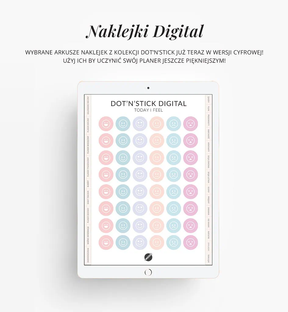 Najniższa cena w ostatnich 30 dniach: 5.90złNaklejki Today I feel w wersji cyfrowej sprawdzą się idealnie do monitorowania swojego nastroju. Zestaw składa się z sześciu okrągłych naklejek w pastelowych kolorach. Na każdej z nich przedstawiona jest inna emocja – np. radość, szczęście, smutek, rozdrażnienie. Zaobserwuj jak zmienia się Twój humor.