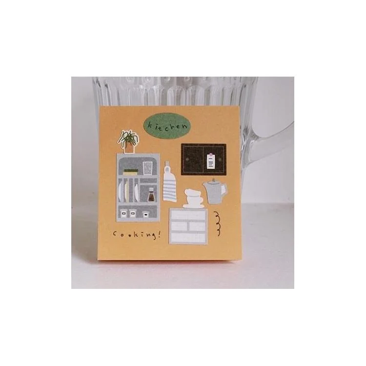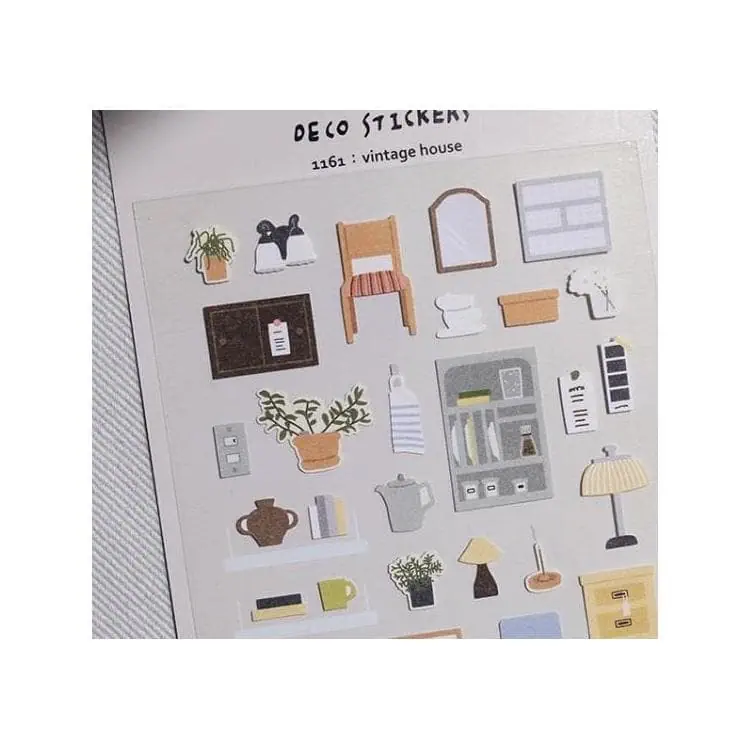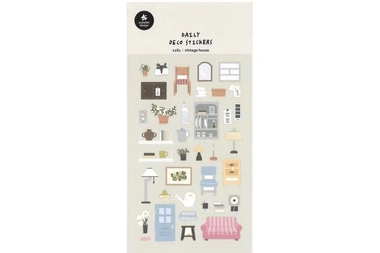 Zestaw składa się z 1 arkusza naklejek. Na naklejkach znajdziesz różne elementy wystroju domu takie jak: sofa, krzesła czy lampy. Naklejki pozwolą Ci zbudować własny vintage dom w Twoim notesie!