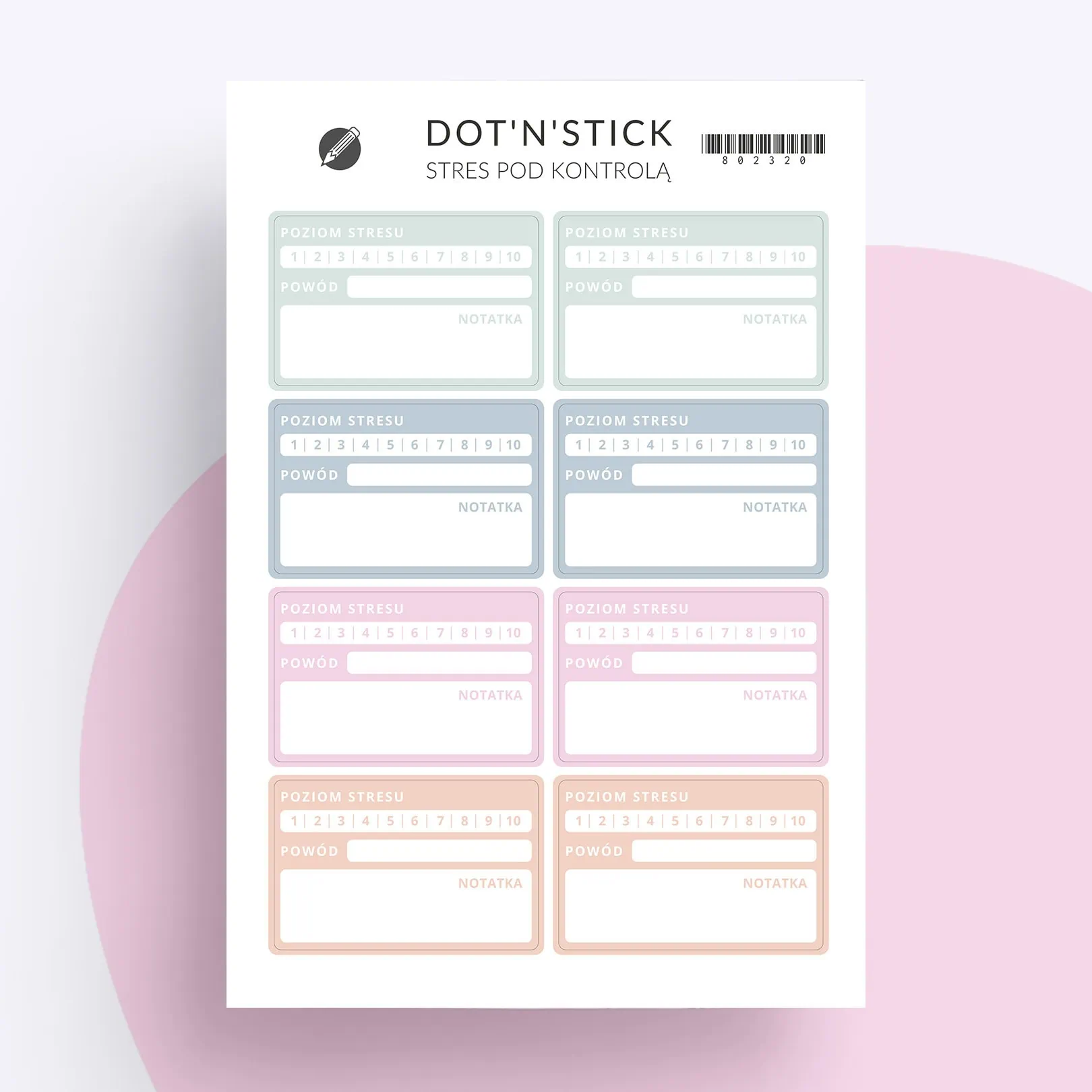 Możesz wkleić je do organizera, planera lub dziennika. Dzięki kompaktowej formie masz swoje zapiski zawsze pod ręką, dokładnie tam, gdzie planujesz i porządkujesz myśli. Regularne monitorowanie napięcia pomaga szybciej wyłapywać trudniejsze momenty i reagować z większą uważnością na swoje potrzeby.