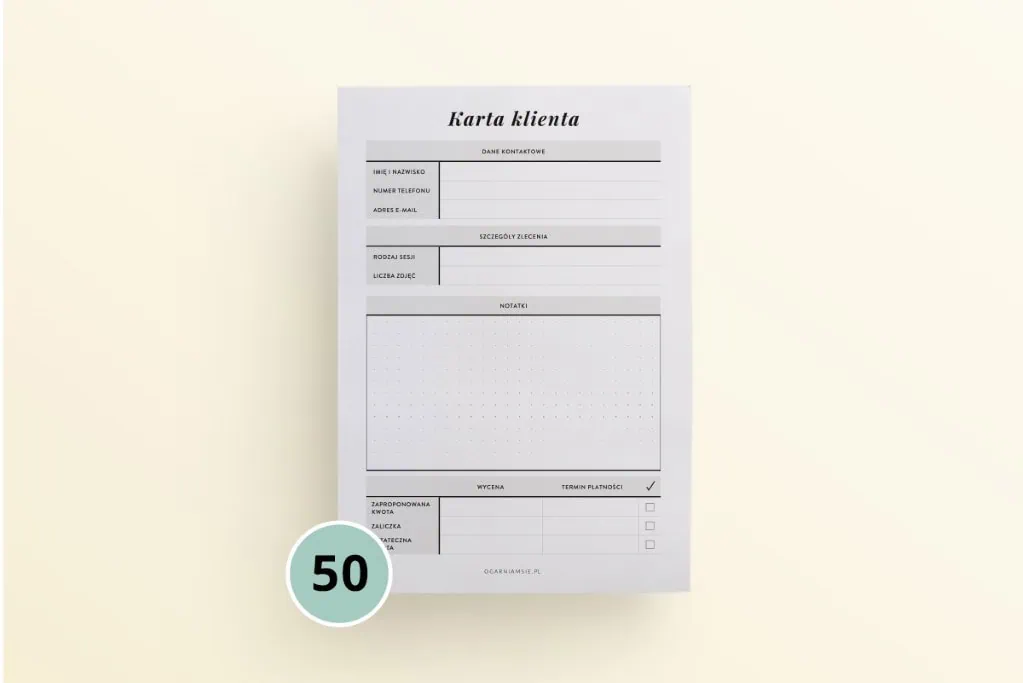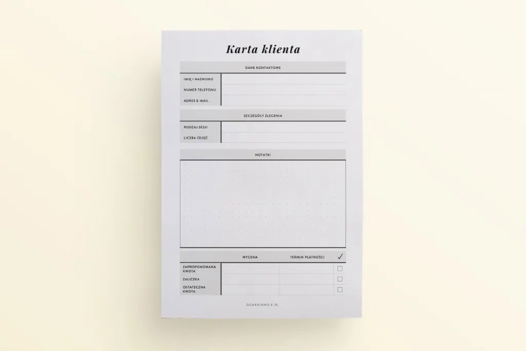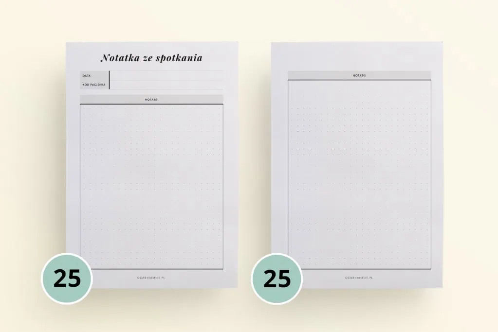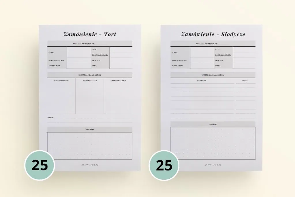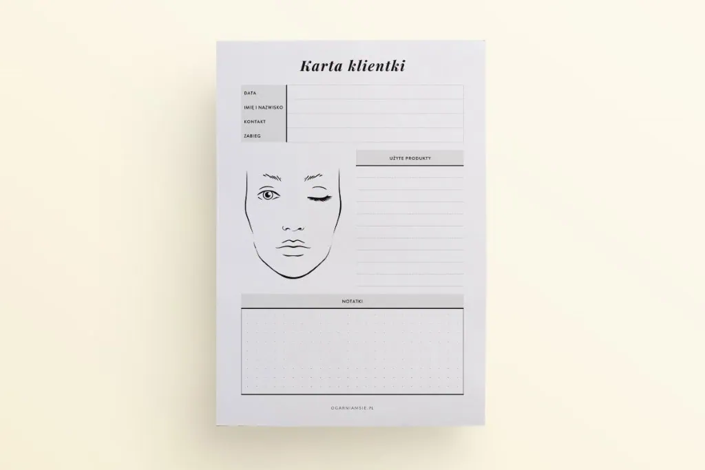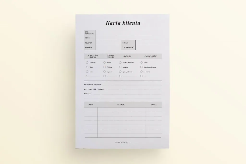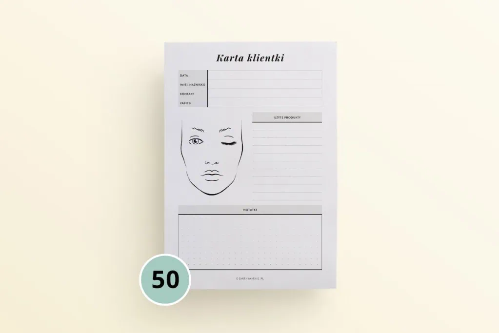 Sprawdź specjalne notesy z wyrywanymi kartami, w których znajdziesz kartę klienta fryzjera, przegląd makijaży i kartę zamówień cukiernika.