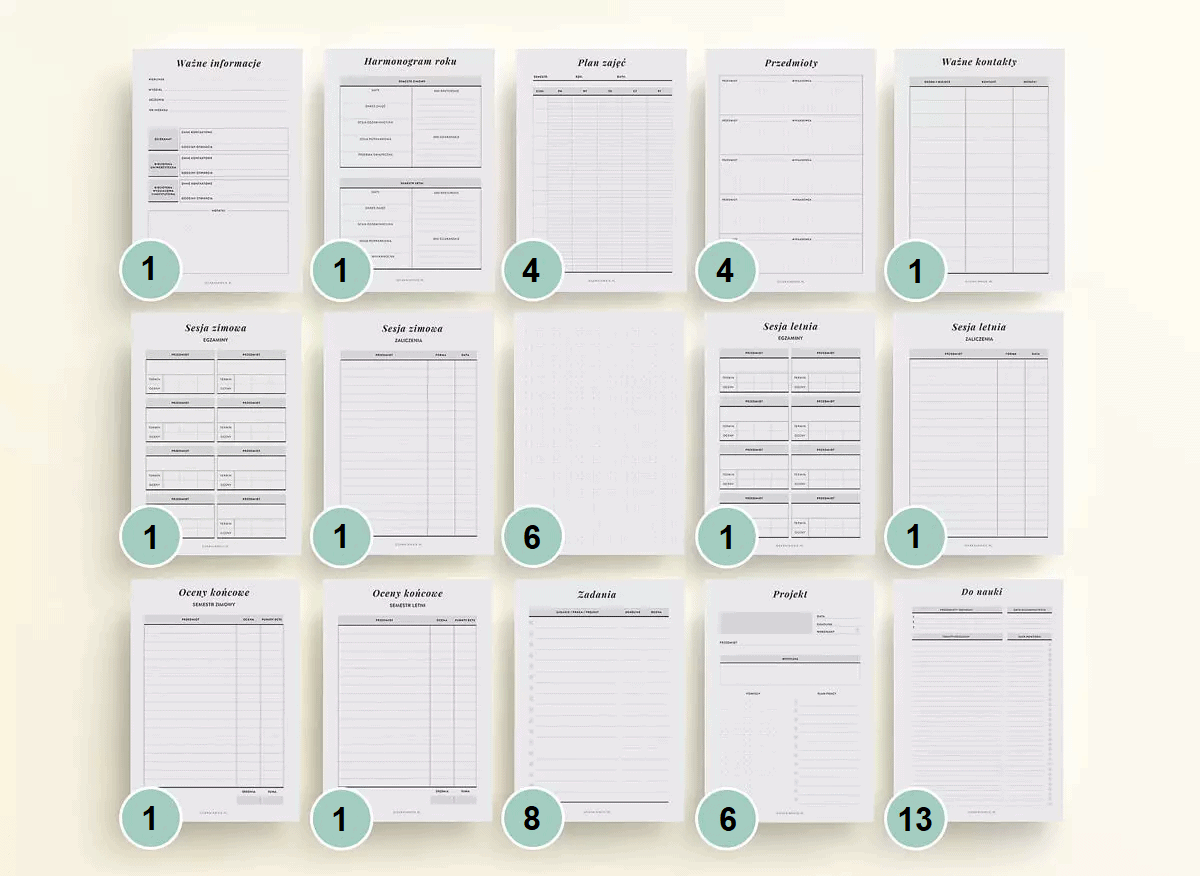 - Szablony dedykowane studentom – wybierz wkład dostosowany do trybu studiów – dziennego lub zaocznego. Zależnie od tego, jak studiujesz, znajdziesz idealny układ, który pomoże Ci ogarnąć terminy i zadania.