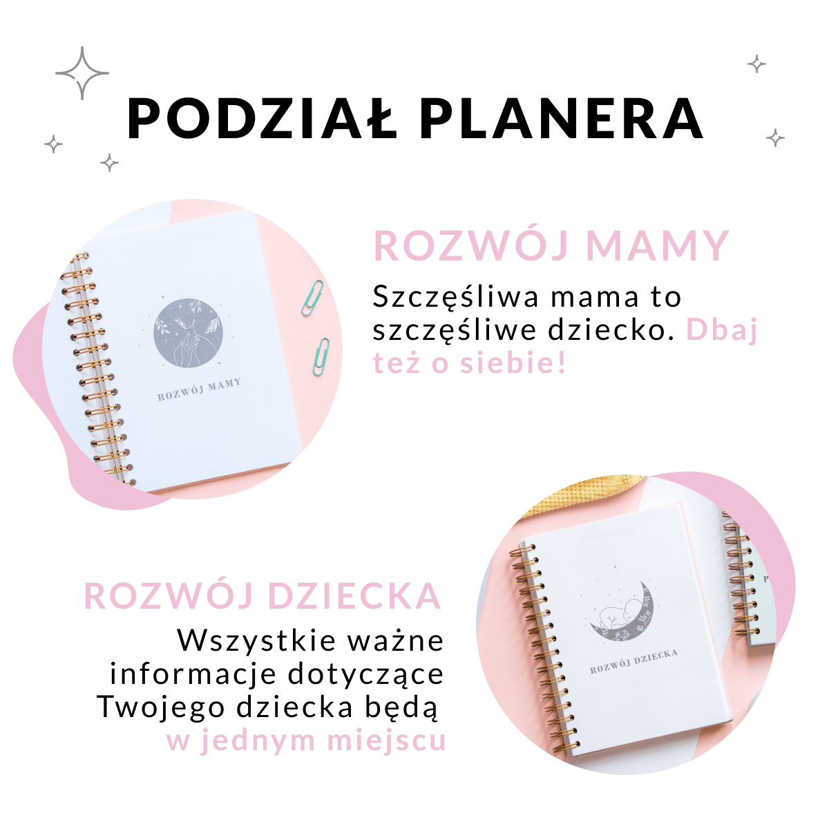 Specjalne strony, który pomogą w kontrolowaniu stanu zdrowia, prawidłowej diety i rozwoju dziecka. W palnerze znajdziesz także specjalne strony dla mamy: zaplanujesz małe przyjemności dla siebie, a także aktywności, aby zadbać również o siebie. Skontrolujesz finanse, aby nie zrujnować swój budżet domowy,