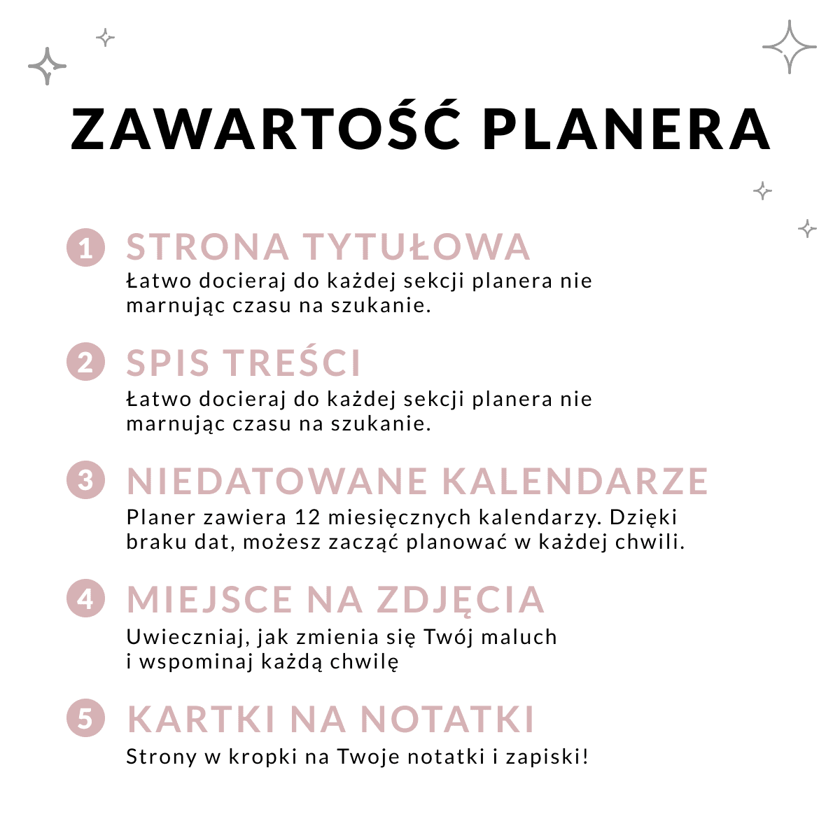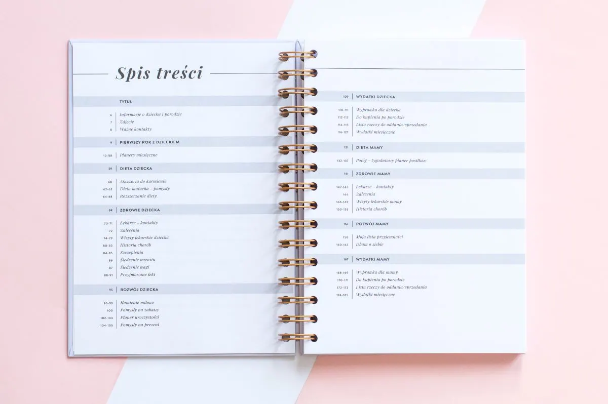 Planer przyszłej mamy podzielony jest na 10 sekcji: wstęp, planer miesięczny bez dat na 12 miesięcy, 4 części dotyczące dziecka i 4 części dotyczące mamy. W planerze znajdziesz miejsce na zapiski dotyczące diety, zdrowia, rozwoju i wydatków. Sprawdź spis treści, by dowiedzieć się, co dokładnie znajduje się w planerze.