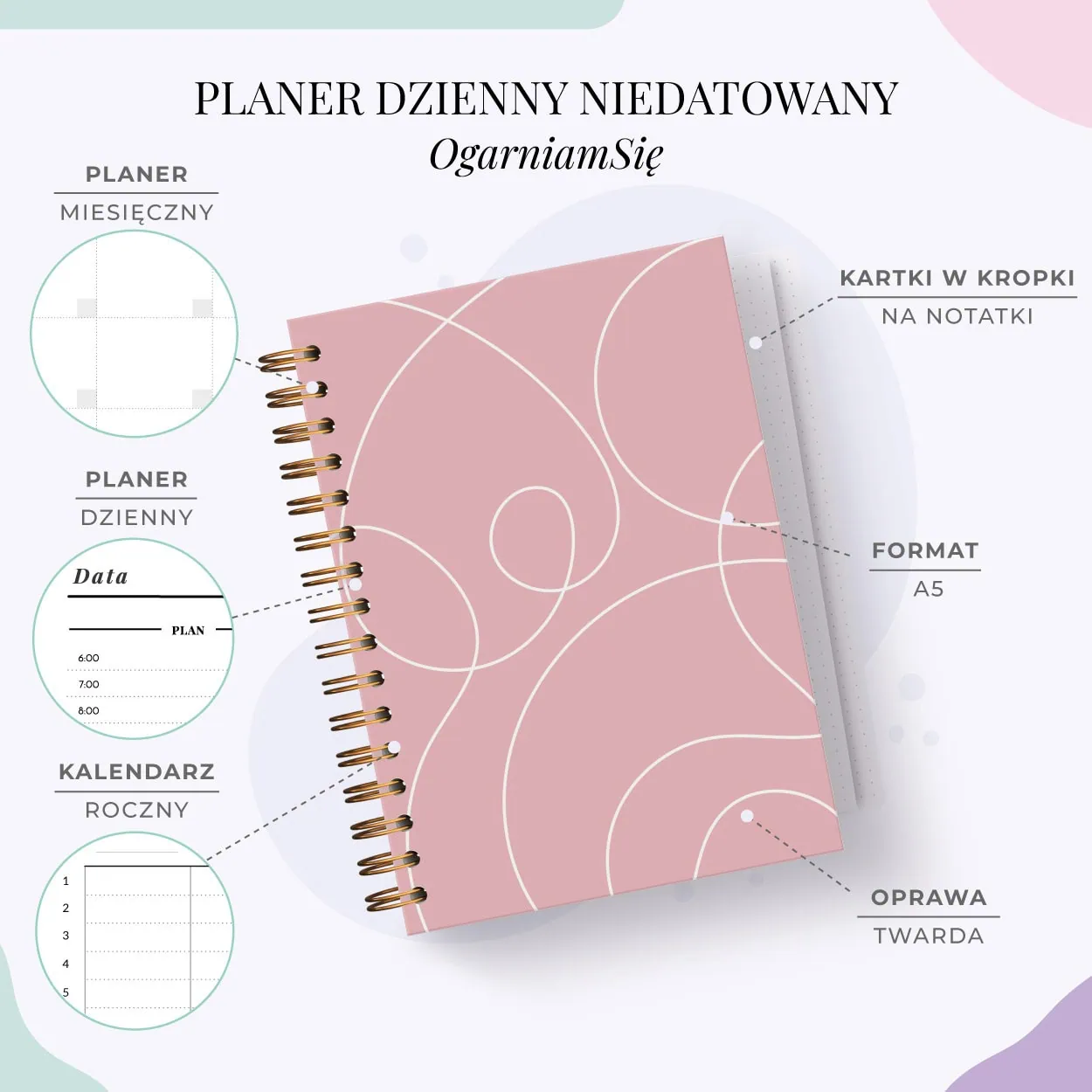 - Brak dat = pełna swoboda – możesz zacząć w dowolnym momencie roku. Planowanie w Twoim tempie, bez martwienia się o puste strony.