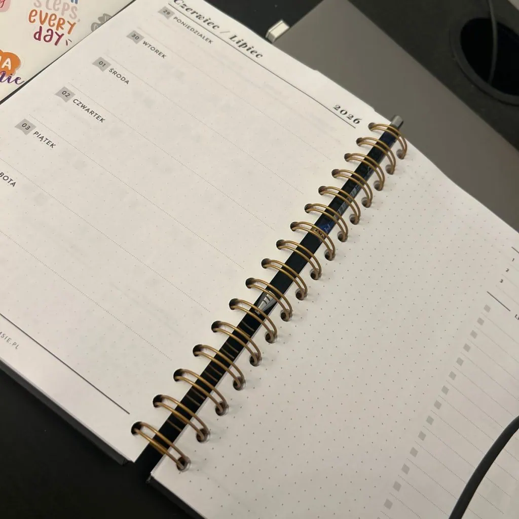 Spirala to możliwość dopasowania planera do sytuacji. Czasem notatki trzeba robić na kolanie - tutaj jest to możliwe! Możesz wygodnie złapać swój planer i otworzyć go na płasko lub założyć okładkę do tyłu.