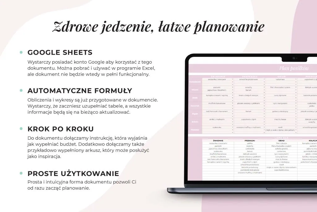 Planuj posiłki w prostym w użyciu Planie posiłków na tydzień – Arkusz Google! Ten planer posiłków online to produkt, który ma wszystko, co potrzeba, by ogarnąć jedzenie na tydzień i do tego wygodnie możesz dzielić go z partnerem/partnerką/najbliższą rodziną! Koniec z pytaniami „A co dziś na obiad?” Planer posiłków excel: