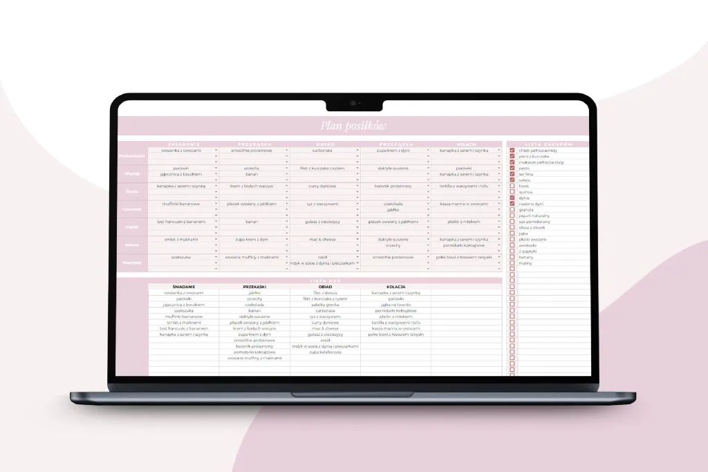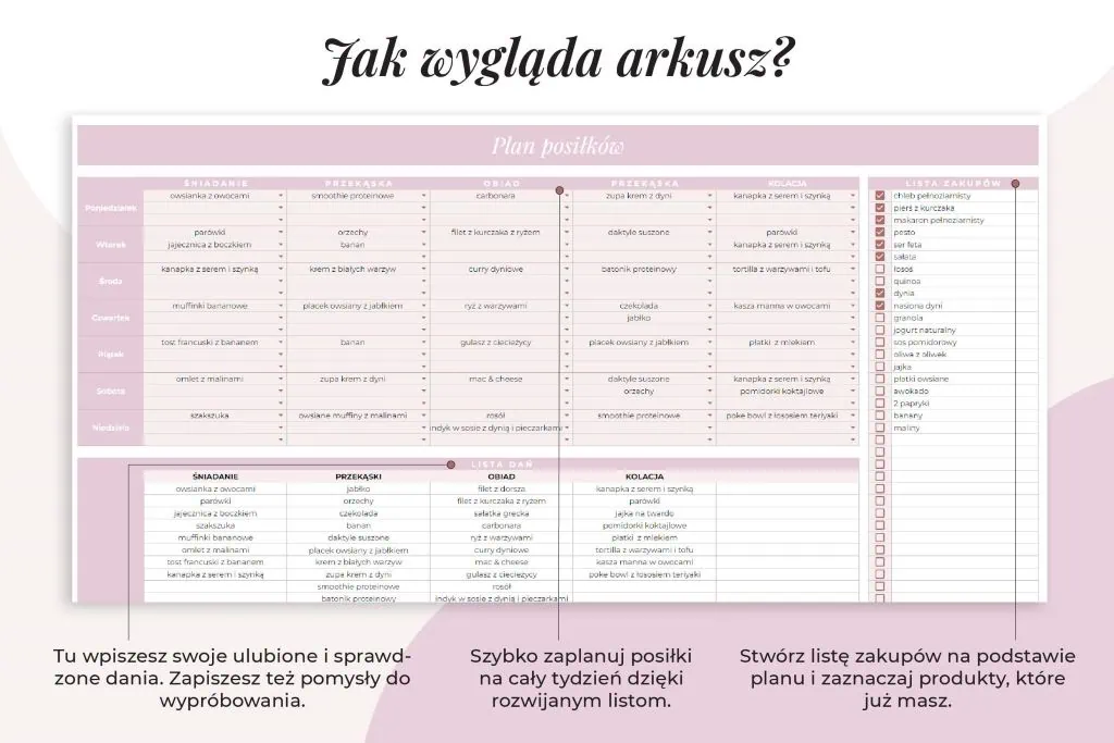 – zautomatyzowany plik – miejsce na listę zakupów, tygodniowy plan 5 posiłków oraz listę dań