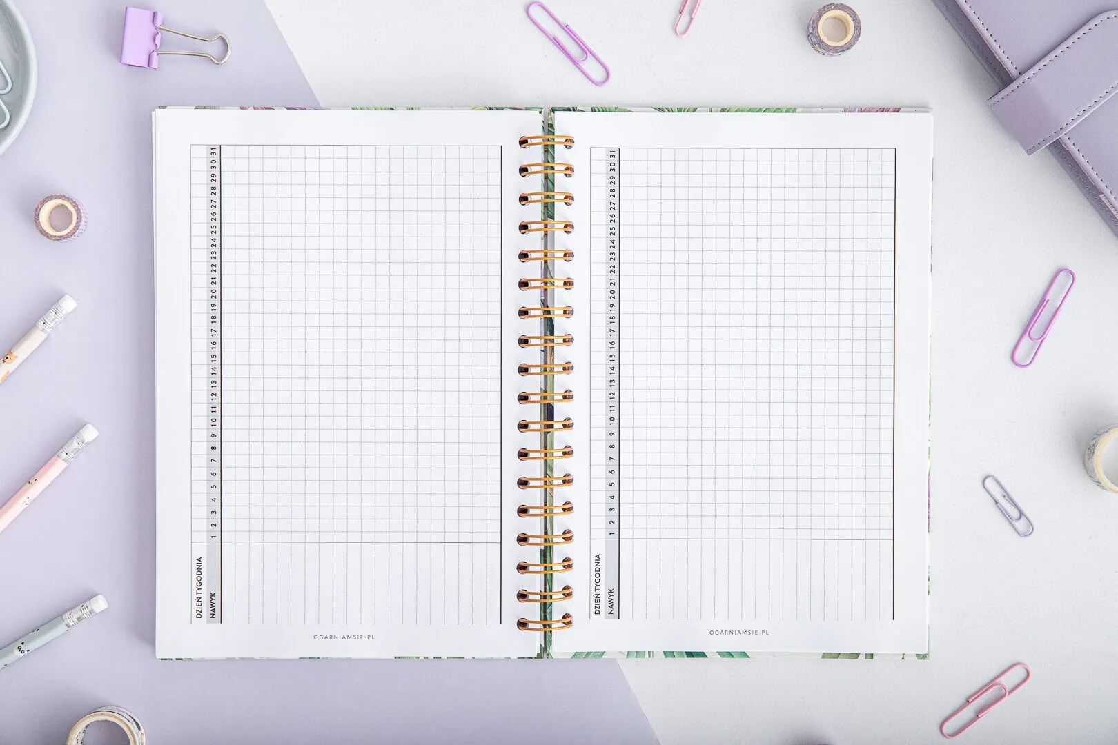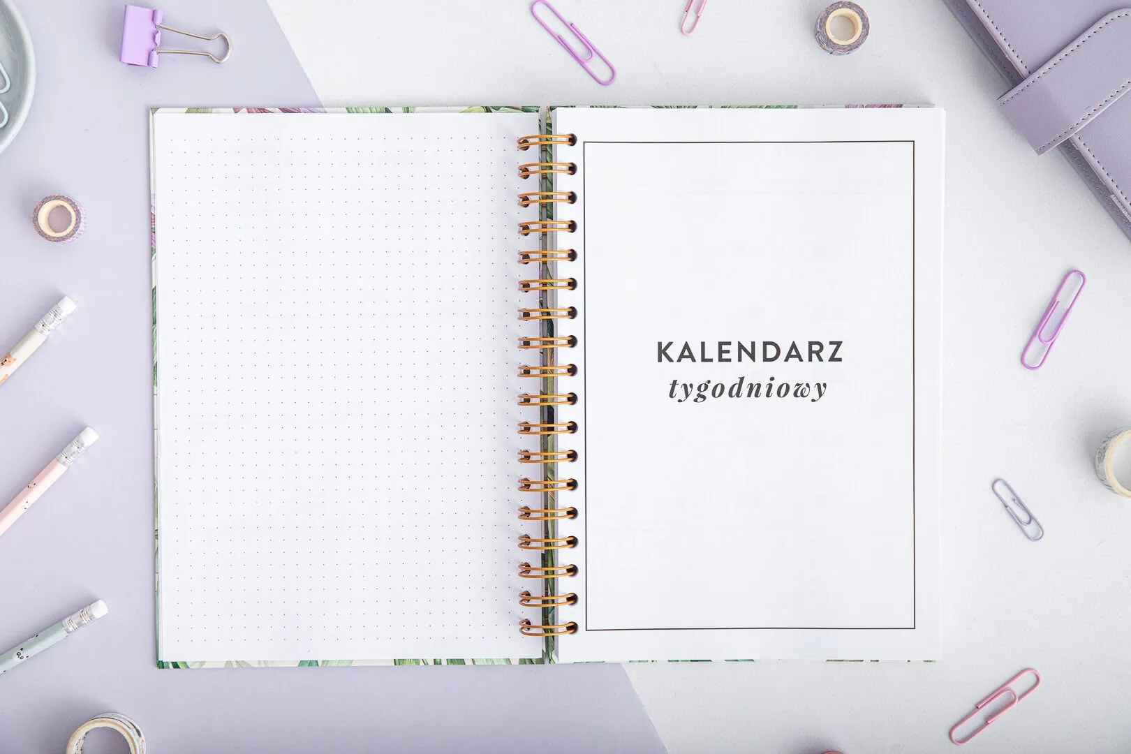 W środku wszystko, czego potrzeba, żeby ogarnąć tydzień i cały rok: kalendarz roczny, miesięczny, tygodniowy, miejsce na listy, zapiski, luźne myśli i konkretne plany. Ten dodatkowy luz na stronie robi różnicę. Możesz wreszcie rozłożyć pomysły na czynniki pierwsze albo wypisać wszystko, co chodzi po głowie.