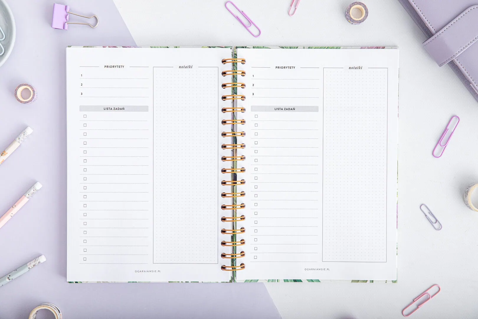 Dzięki spiralnej oprawie planer otwiera się równo na każdej stronie, a okładkę możesz wygodnie założyć do tyłu.