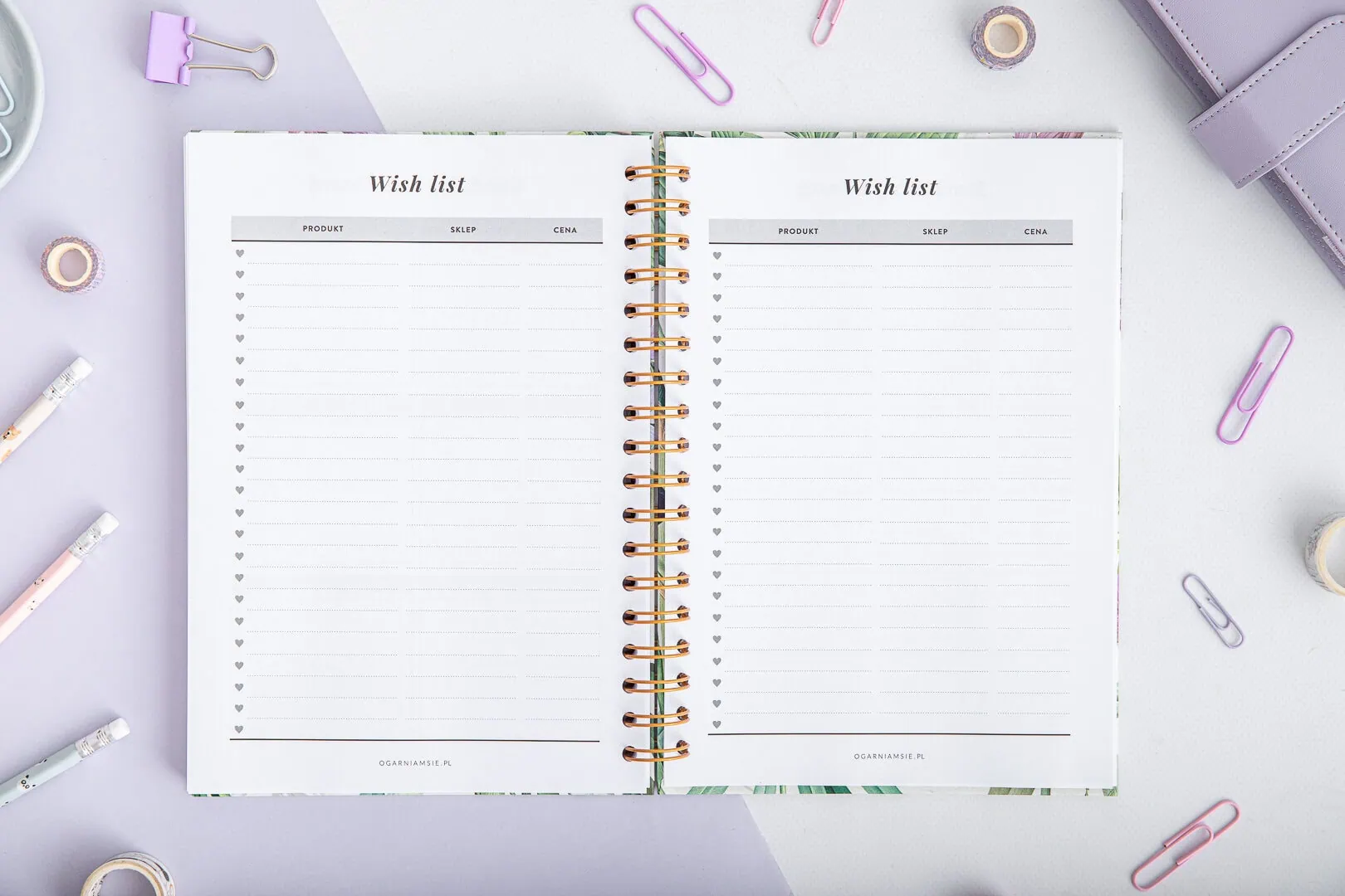 Na końcu planera znajdziesz dedykowane miejsce na listy zadań, habit tracker, kontakty, adresy i wishlisty. Wszystko po to, żeby jeszcze łatwiej ogarnąć cały rok — po swojemu!