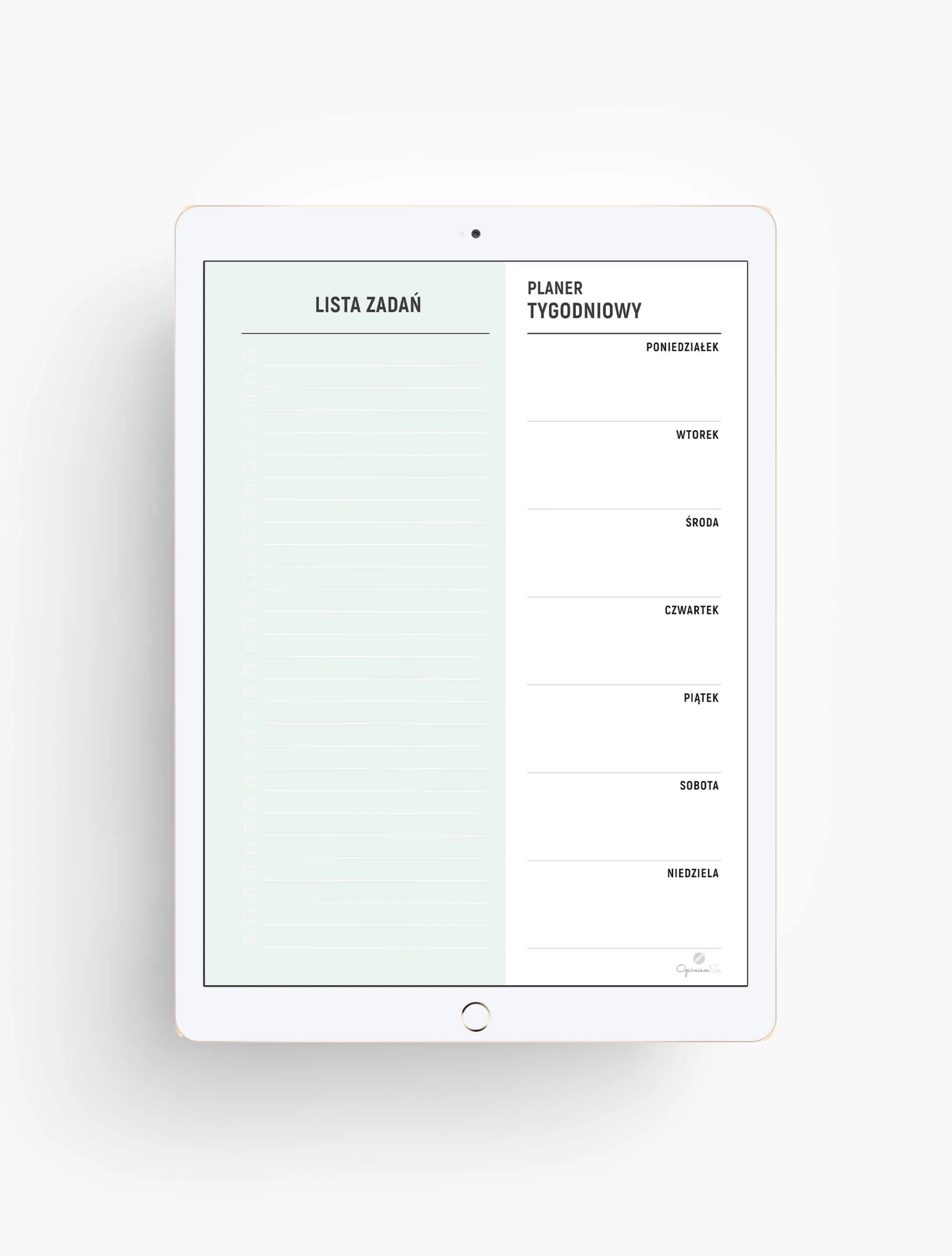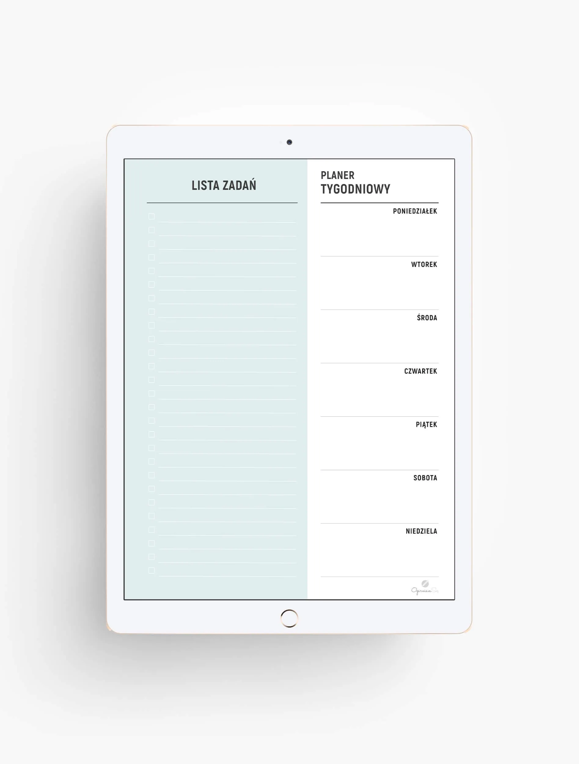 Minimalistyczny i bardzo funkcjonalny planer cyfrowy tygodniowy. Szablon podzielony jest na dwie części: