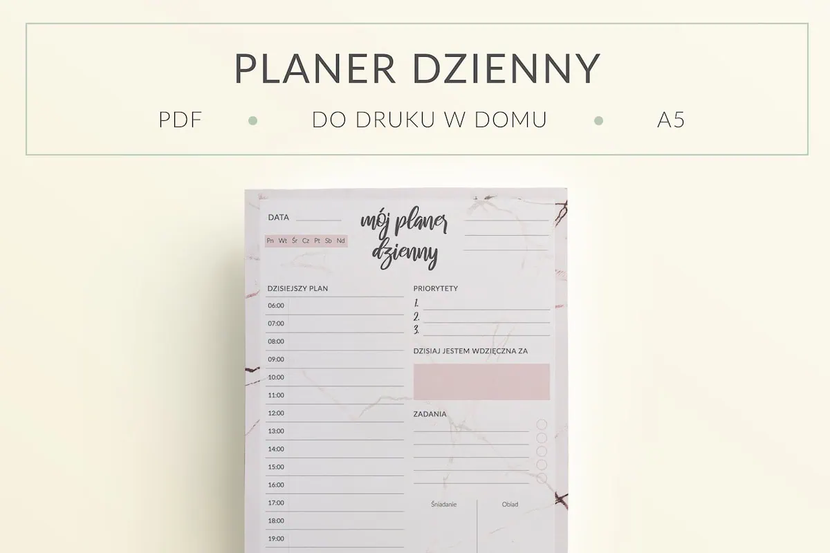 Najniższa cena w ostatnich 30 dniach: 9.90złZ eleganckim planerem dziennym „Marmur” do samodzielnego wydrukowania zorganizujesz każdy swój dzień! Na pięknym różowym szablonie rozpiszesz godzinowy plan dnia. Ponadto z tym planerem określisz swoje priorytety i najważniejsze zadania oraz zastanowisz się nad planem posiłków. I oczywiście nie zapominajmy o odrobinie pozytywnej energii – codziennie zastanów się, co dobrego Cię spotkało!