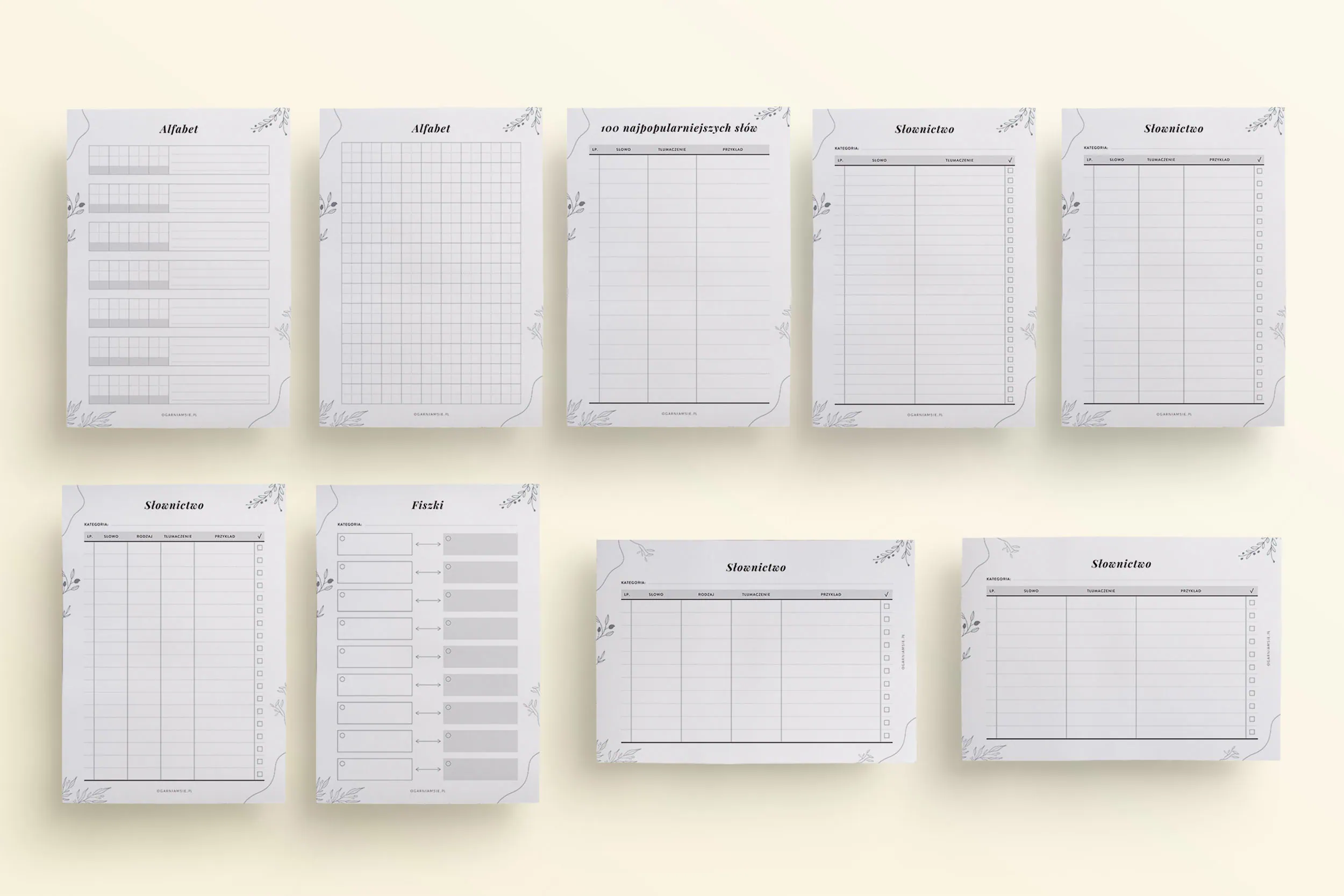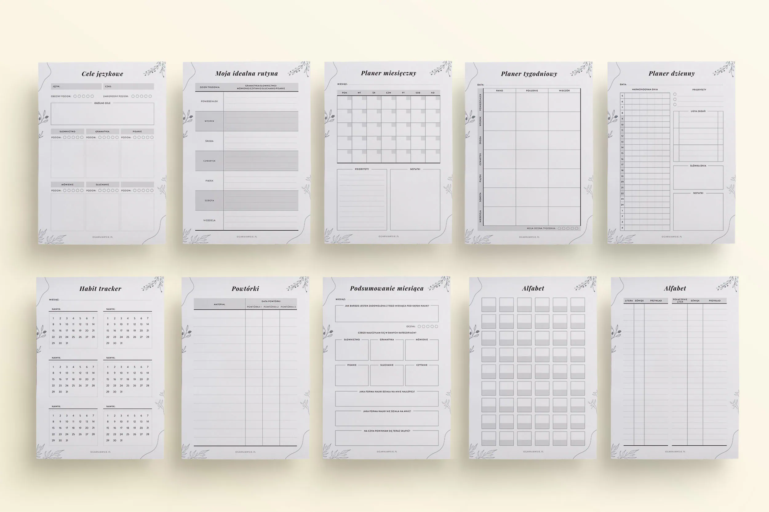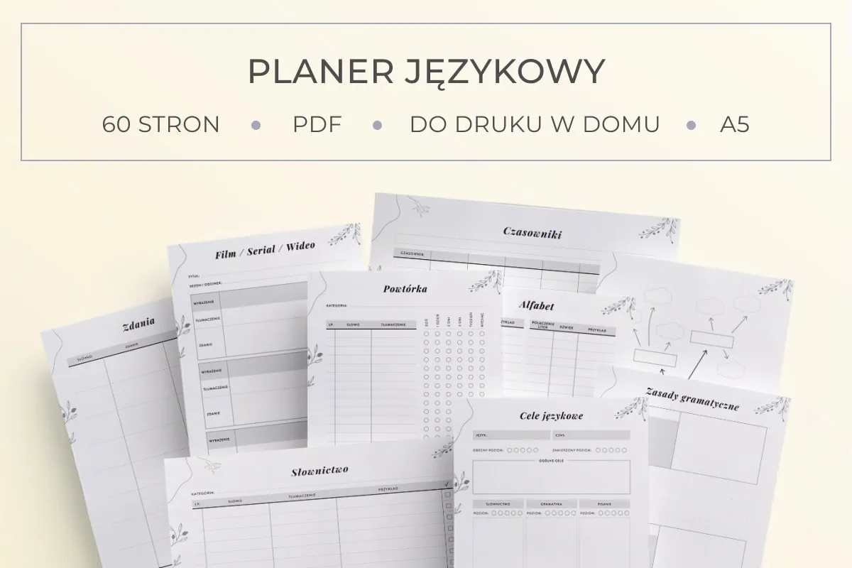 Planer językowy do druku to aż 60 stron! Znajdziesz w nim następujące szablony: