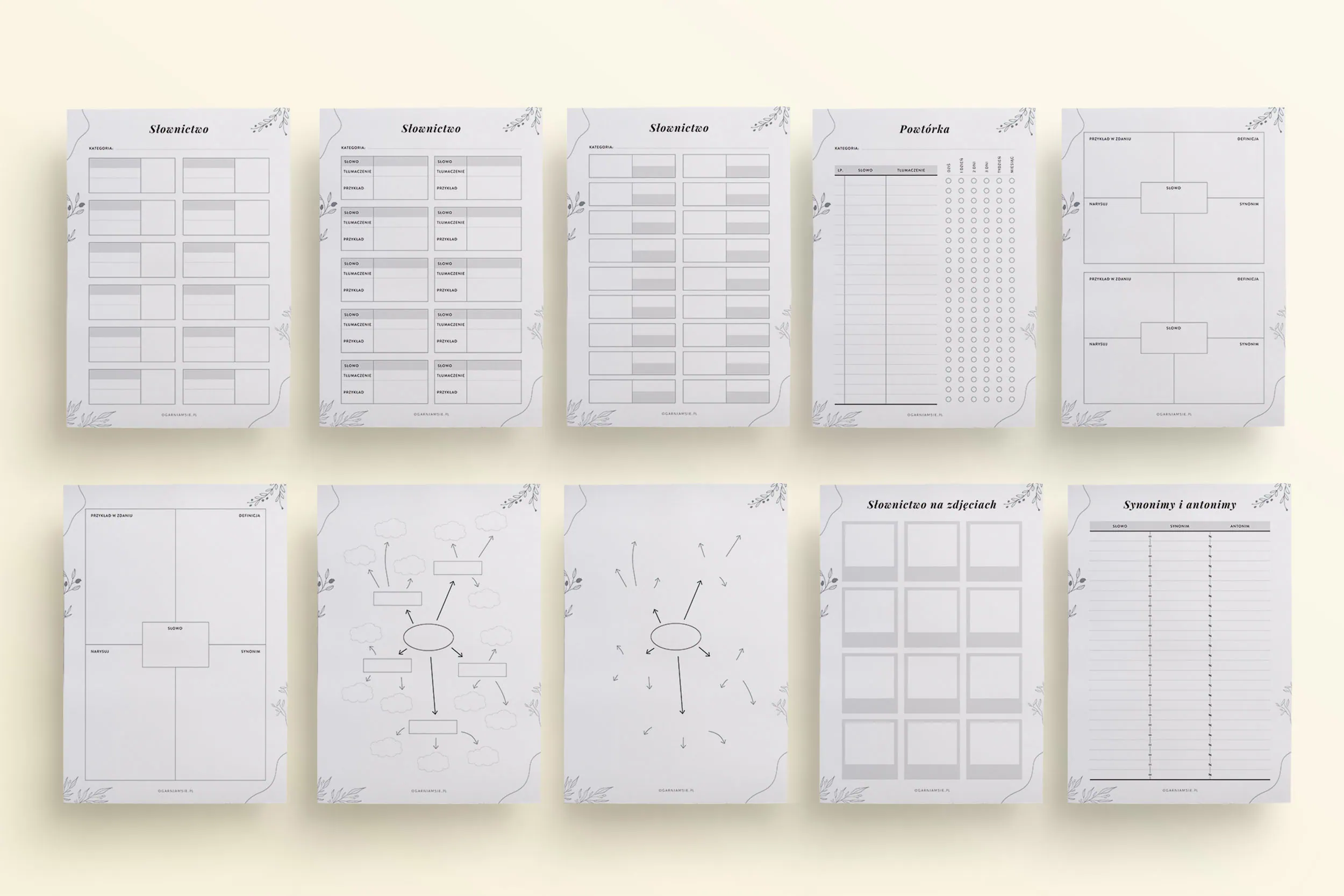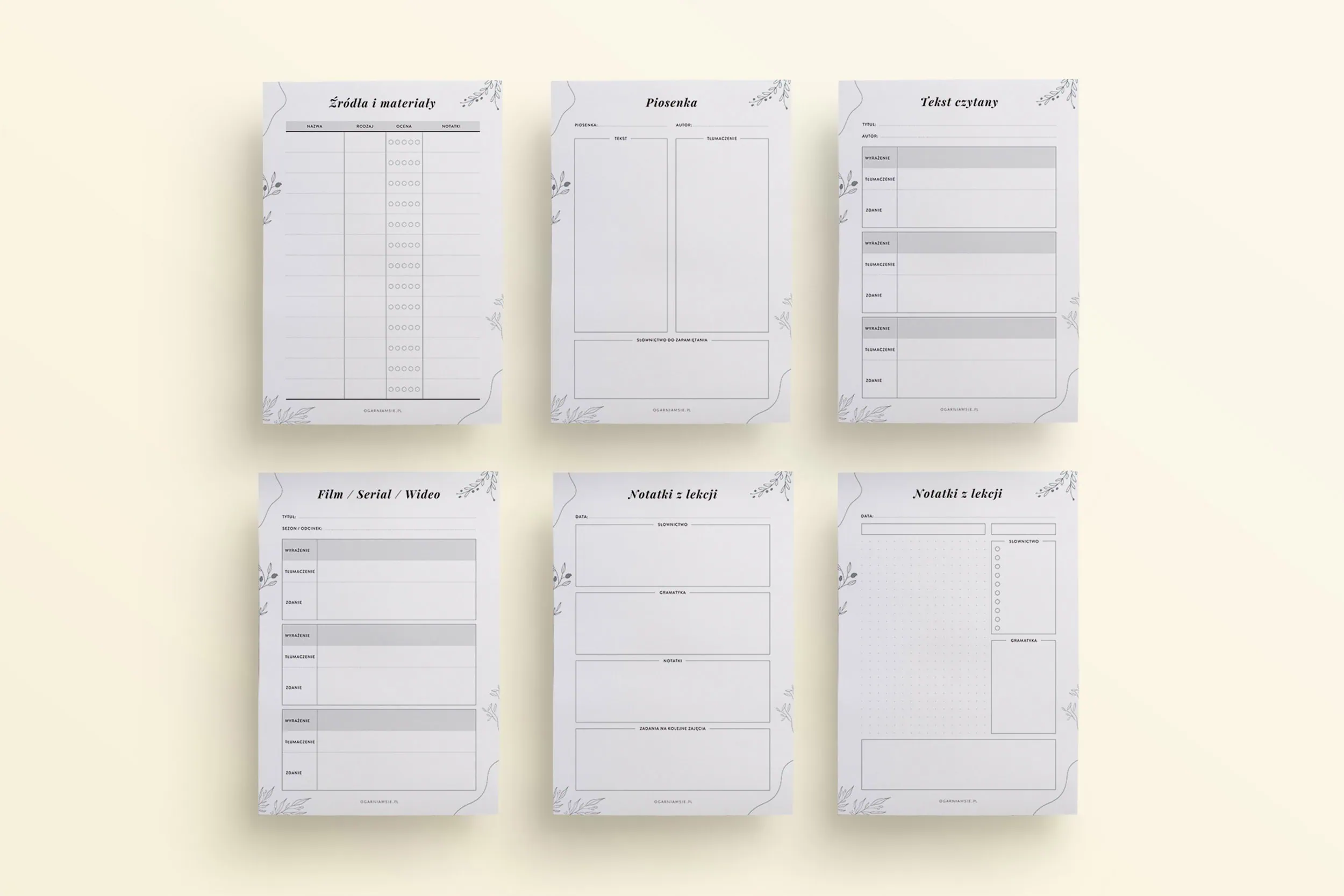 - 3 szablony do zbierania innych materiałów do nauki