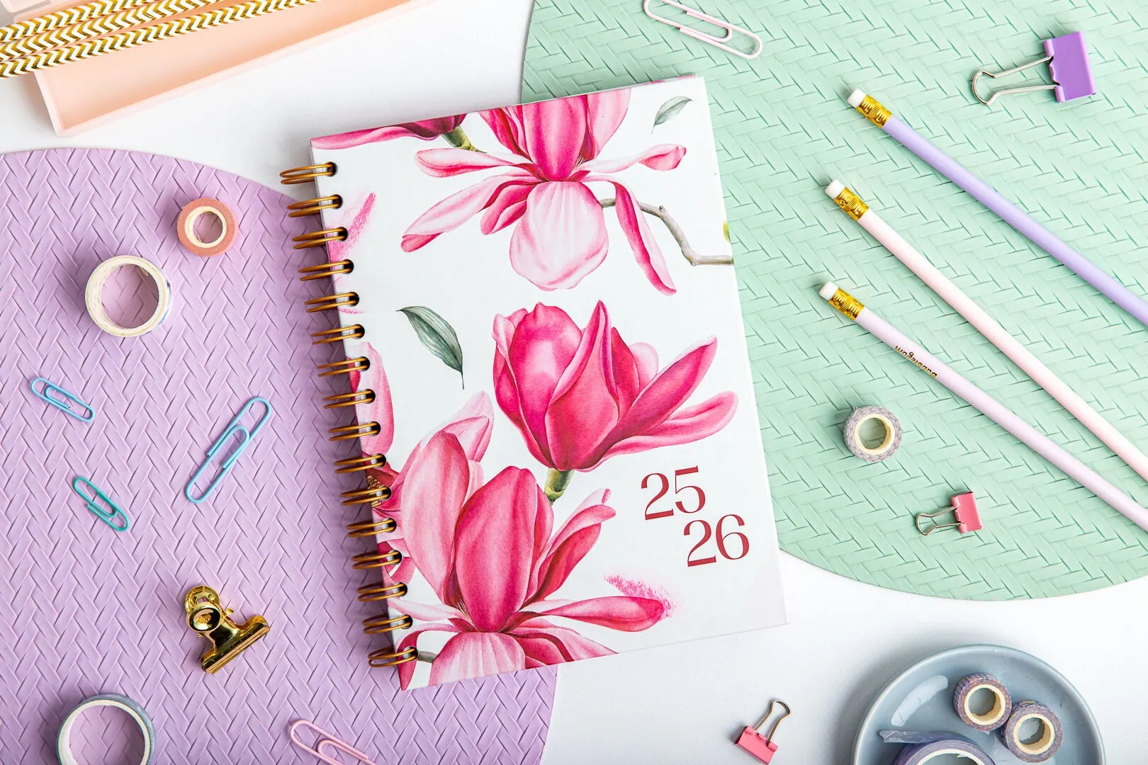 Nasz planer - prócz szablonów dotyczących organizacji - zawiera też po prostu kalendarz. Wybieraj spośród wielu wzorów twardych okładek i ciesz się datowanym wkładem od 28 lipca 2025 do 2 sierpnia 2026. Okładka jest bardzo wytrzymała i funkcjonalna - posiada gumkę spinającą oraz ma możliwość dodania koperty na drobiazgi.