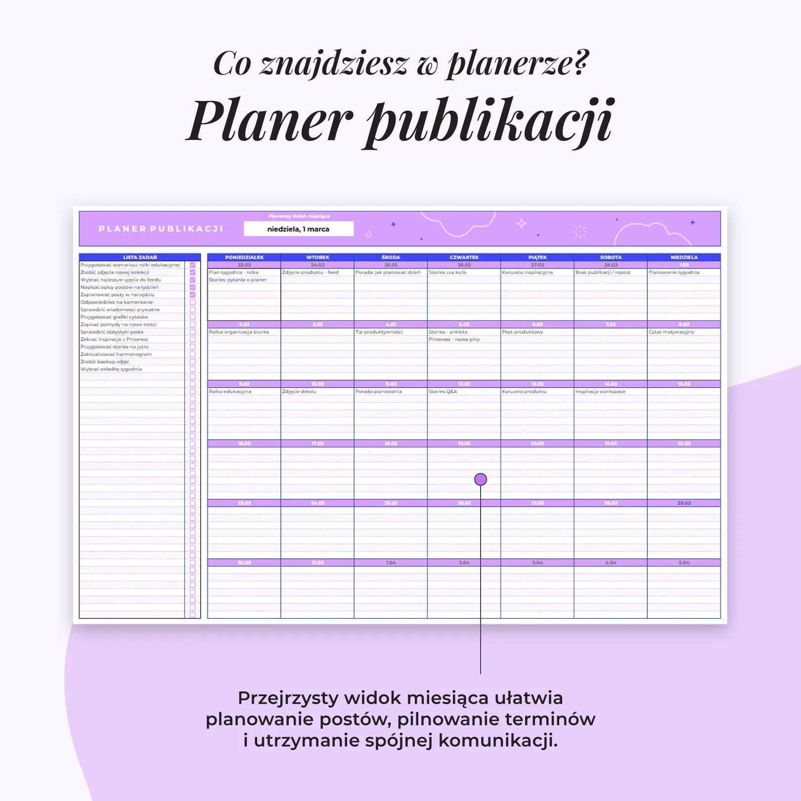 - Spokojny plan zamiast działania na ostatnią chwilę - rozpisujesz harmonogram, dzięki któremu wiesz, co i kiedy się pojawi. Treści przestają być przypadkiem - mają swój rytm.
