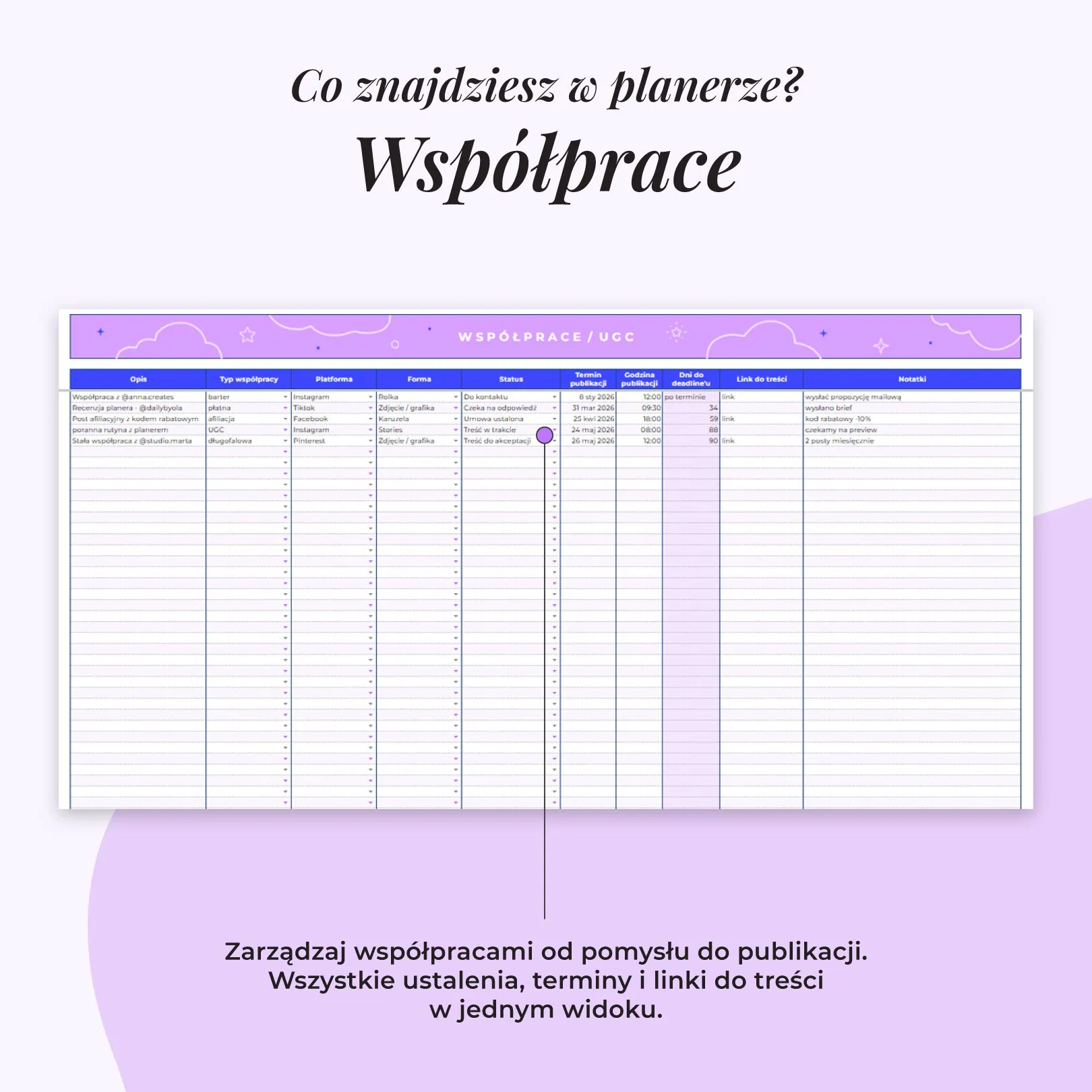 - Terminy, które nie uciekają - automatyczne formuły pilnują statusów i dat, żebyś nie musiała trzymać wszystkiego w głowie.