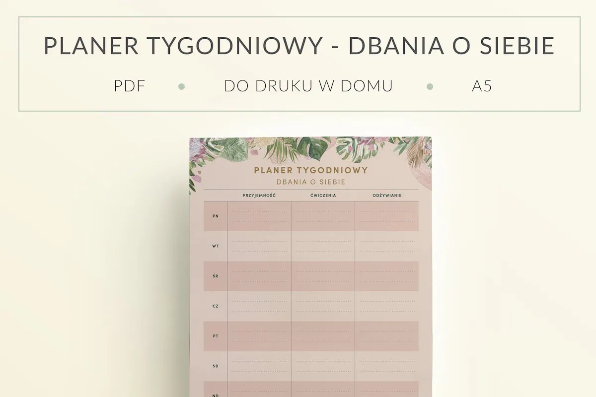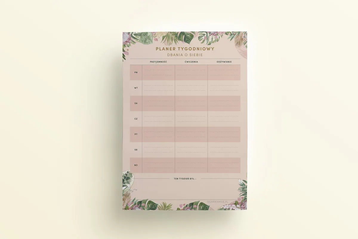 Wybierz piękny planer dbania o siebie i podaruj sobie wyjątkowy prezent! Planer tygodniowy do druku został przygotowany tak, aby pomóc Ci znaleźć czas tylko dla siebie. Zadbaj o swoje zdrowie, urodę i kobiecość. Zaplanuj codzienną przyjemność, ćwiczenia oraz odżywianie i spraw, że każdy tydzień będzie Twoim tygodniem!