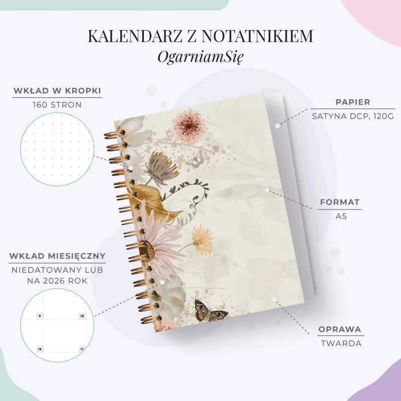 Kalendarz notatnik to doskonałe rozwiązanie dla tych, którzy nie chcą tracić pieniędzy na nieużywane strony kalendarza. Poza tym, dzięki uniwersalnej formie, nasz kalendarz z notatnikiem w kropki może być używany w dowolnym roku.