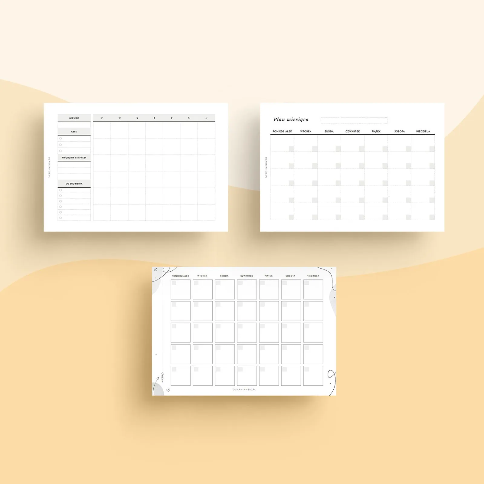 - Miesiąc w pionie – klasyczny układ z dniami tygodnia i przestrzenią na codzienne notatki