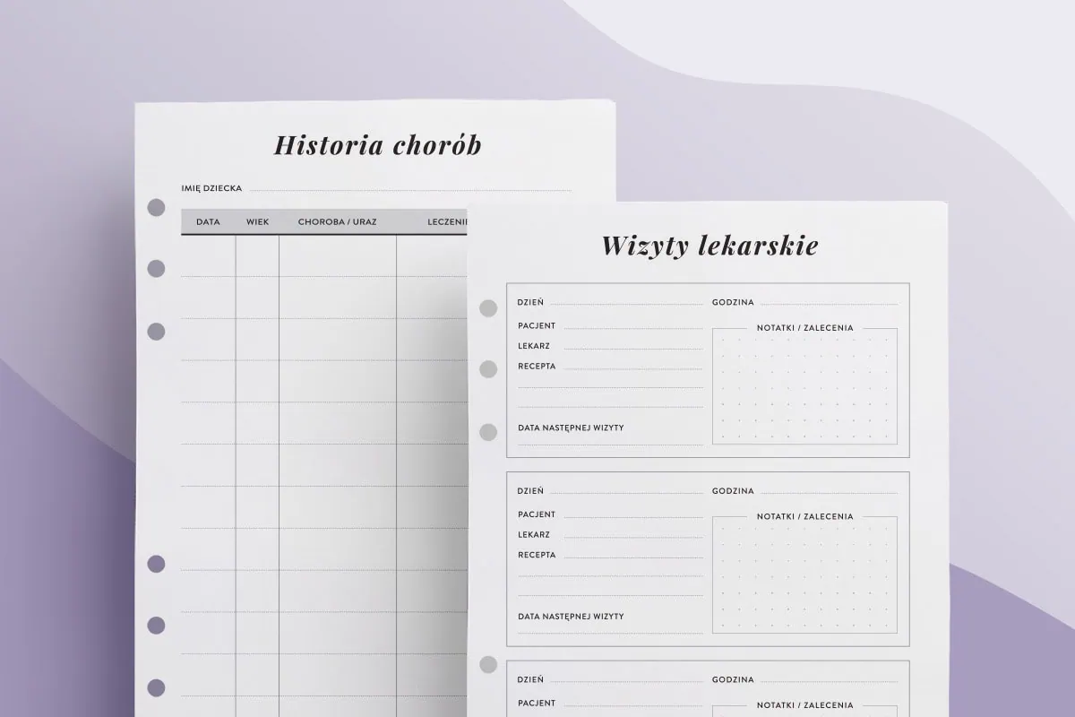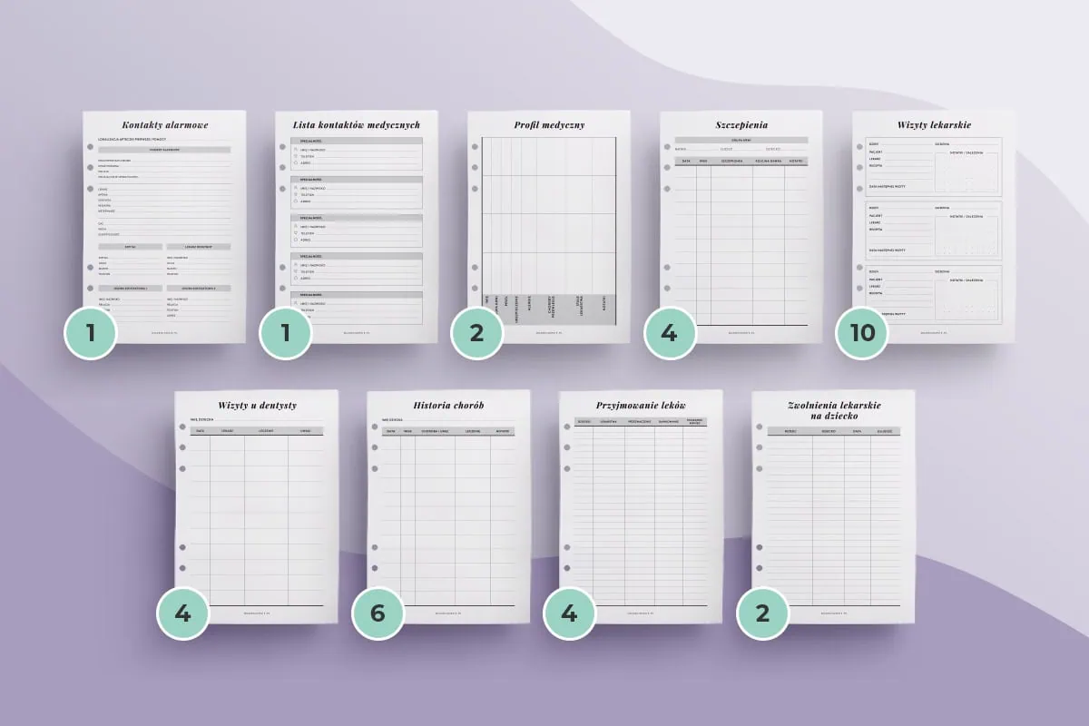 Rodzinne karty medyczne to idealne wsparcie dla każdej mamy, która chce uporządkować informacje o zdrowiu najbliższych. Wkład zawiera szablony takie jak: kontakty alarmowe, lista kontaktów medycznych, profil medyczny, szczepienia, wizyty lekarskie, wizyty u dentysty, historia chorób, przyjmowanie leków, zwolnienia lekarskie na dziecko