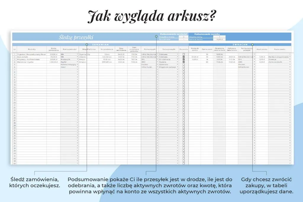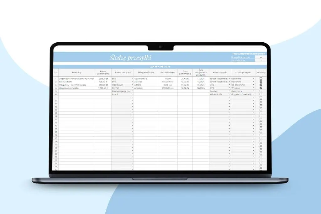 – zautomatyzowany plik – miejsce na spis zamówień oraz monitorowanie zwrotów