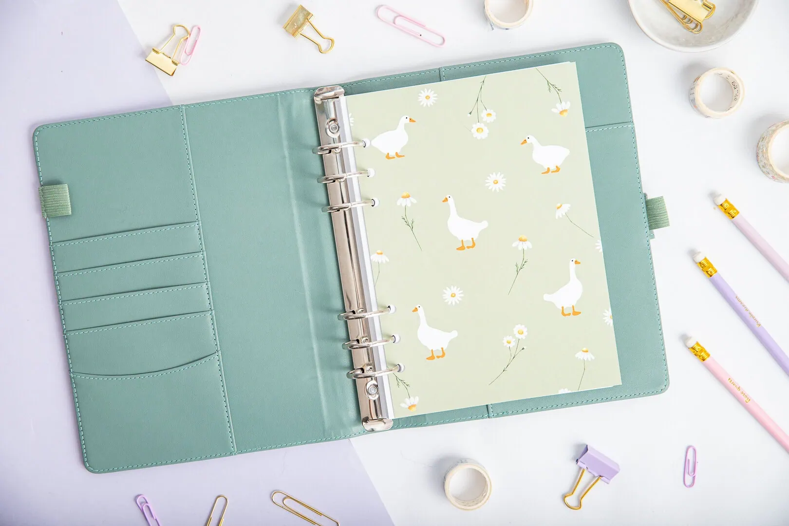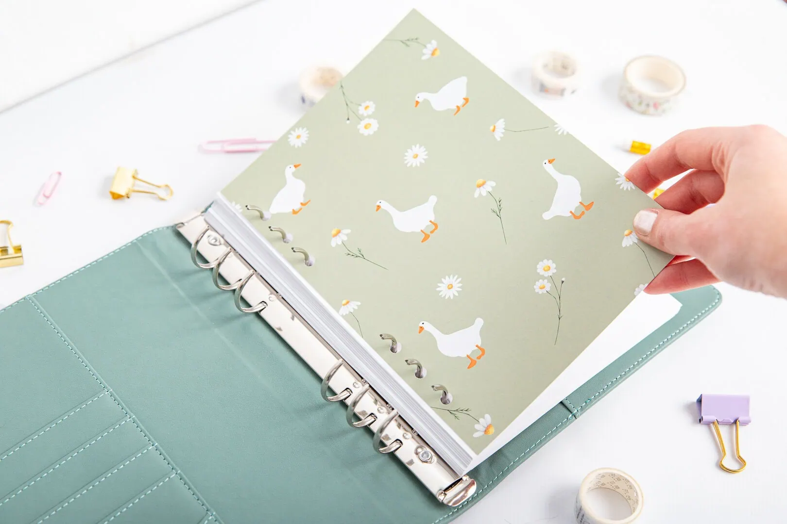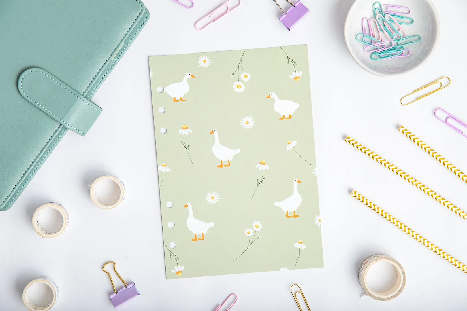 Strona tytułowa do organizera – Gąski to świetny sposób na porządek w notatkach. Delikatny wzór z wesołymi gąskami i kwiatami pełni rolę separatora, rozdzielając sekcje organizera i nadając mu wyjątkowy charakter.